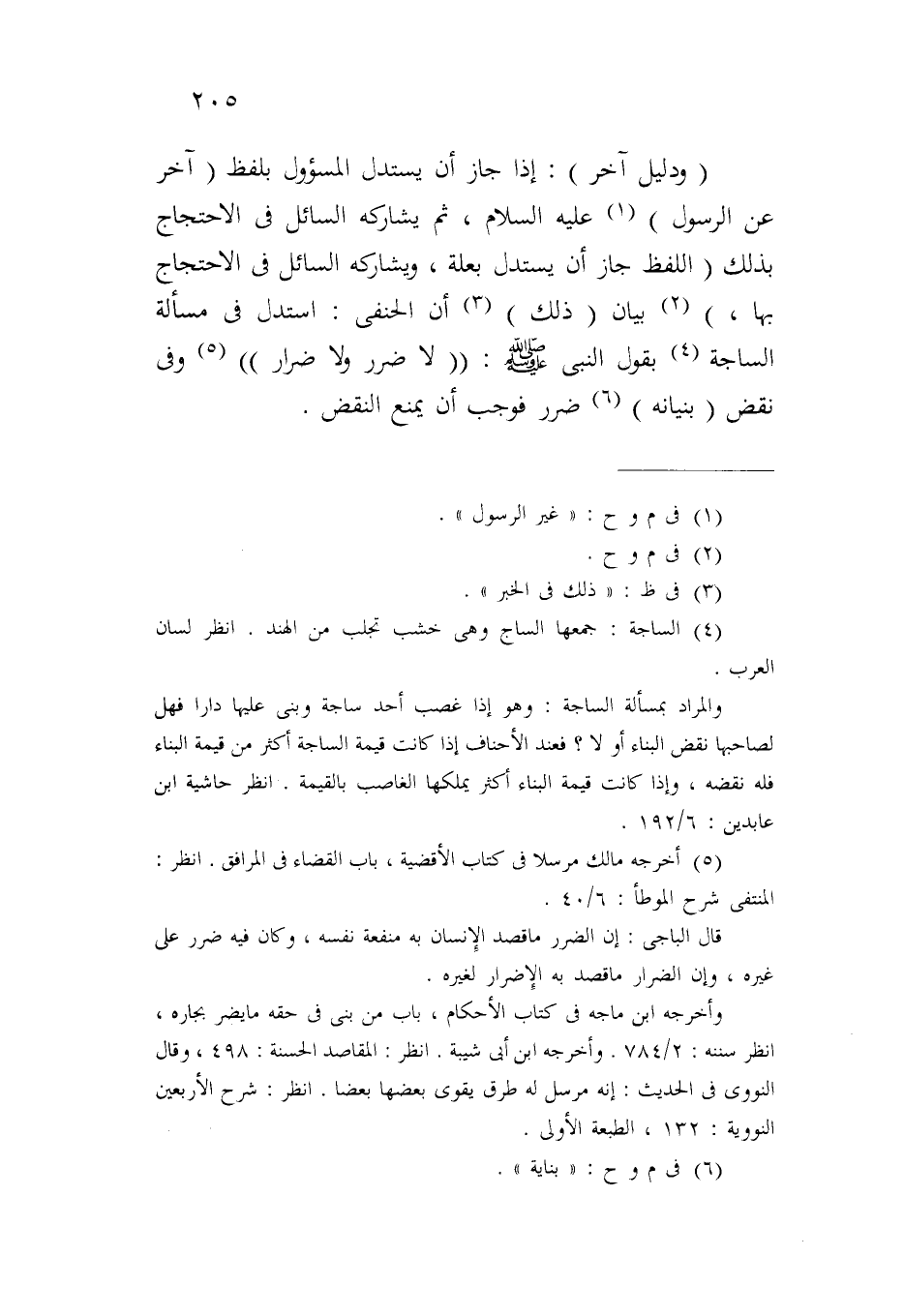 (ودليل آخر): إذا جاز أن يستدل المسؤول بلفظ (آخر عن الرسول) عليه السلام، ثم يشاركه السائل في الاحتجاج بذلك (اللفظ جاز أن يستدل بعلة، ويشاركه السائل في الاحتجاج بها)، بيان (ذلك) أن الحنفي: استدل في مسألة الساجة بقول النبي صلى الله عليه وسلم: "لا ضرر ولا ضرار" وفي نقض (بنيانه) ضرر فوجب أن يمنع النقض.
