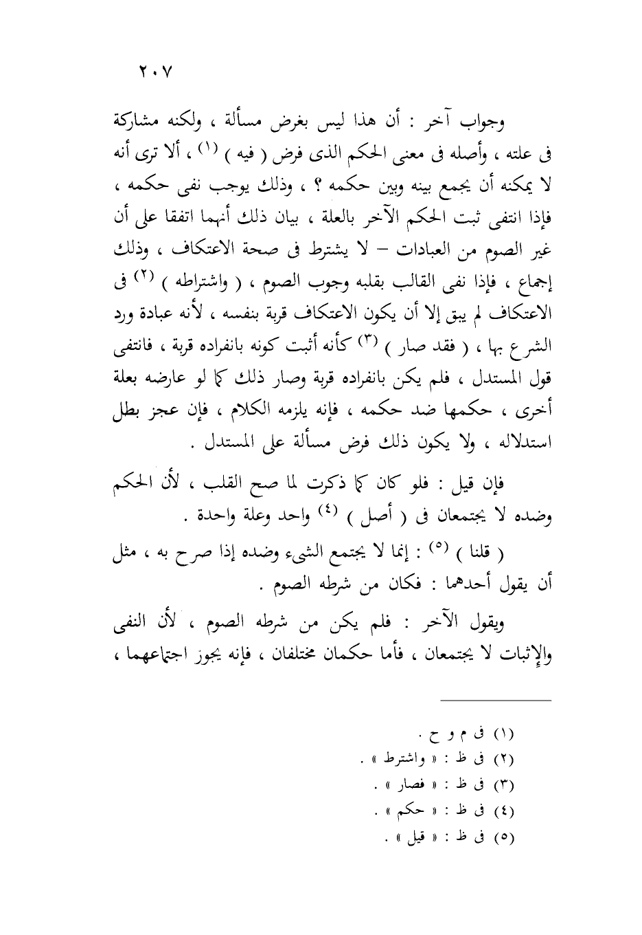 وجواب آخر: أن هذا ليس بغرض مسألة، ولكنه مشاركة في علته، وأصله في معنى الحكم الذي فرض (فيه)، ألا ترى أنه لا يمكنه أن يجمع بينه وبين حكمه؟، وذلك يوجب نفي حكمه، فإذا انتفى ثبت الحكم الآخر بالعلة، بيان ذلك أنهما اتفقا على أن غير الصوم من العبادات - لا يشترط في صحة الاعتكاف، وذلك إجماع، فإذا نفى القالب بقلبه وجوب الصوم، (واشتراطه) في الاعتكاف لم يبق إلا أن يكون الاعتكاف قربة بنفسه، لأنه عبادة ورد الشرع بها، (فقد صار) كأنه أثبت كونه بانفراده قربة، فانتفى قول المستدل، فلم يكن بانفراده قربة وصار ذلك كما لو عارضه بعلة أخرى، حكمها ضد حكمه، فإنه يلزمه الكلام، فإن عجز بطل استدلاله، ولا يكون ذلك فرض مسألة على المستدل.