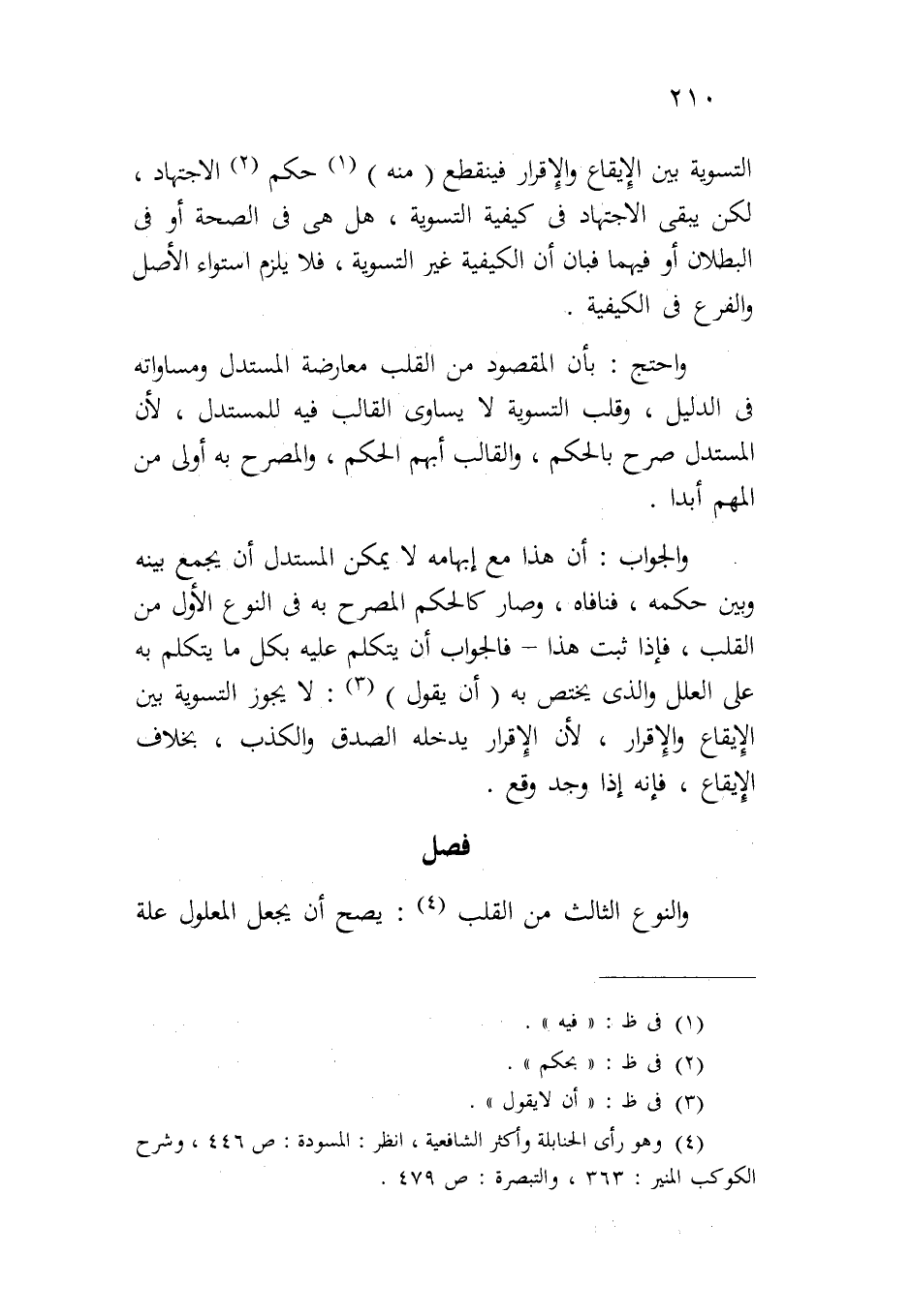التسوية بين الإيقاع والإقرار فينقطع (منه) حكم الاجتهاد، لكن يبقى الاجتهاد في كيفية التسوية، هل هي في الصحة أو في البطلان أو فيهما فبان أن الكيفية غير التسوية، فلا يلزم استواء الأصل والفرع في الكيفية.