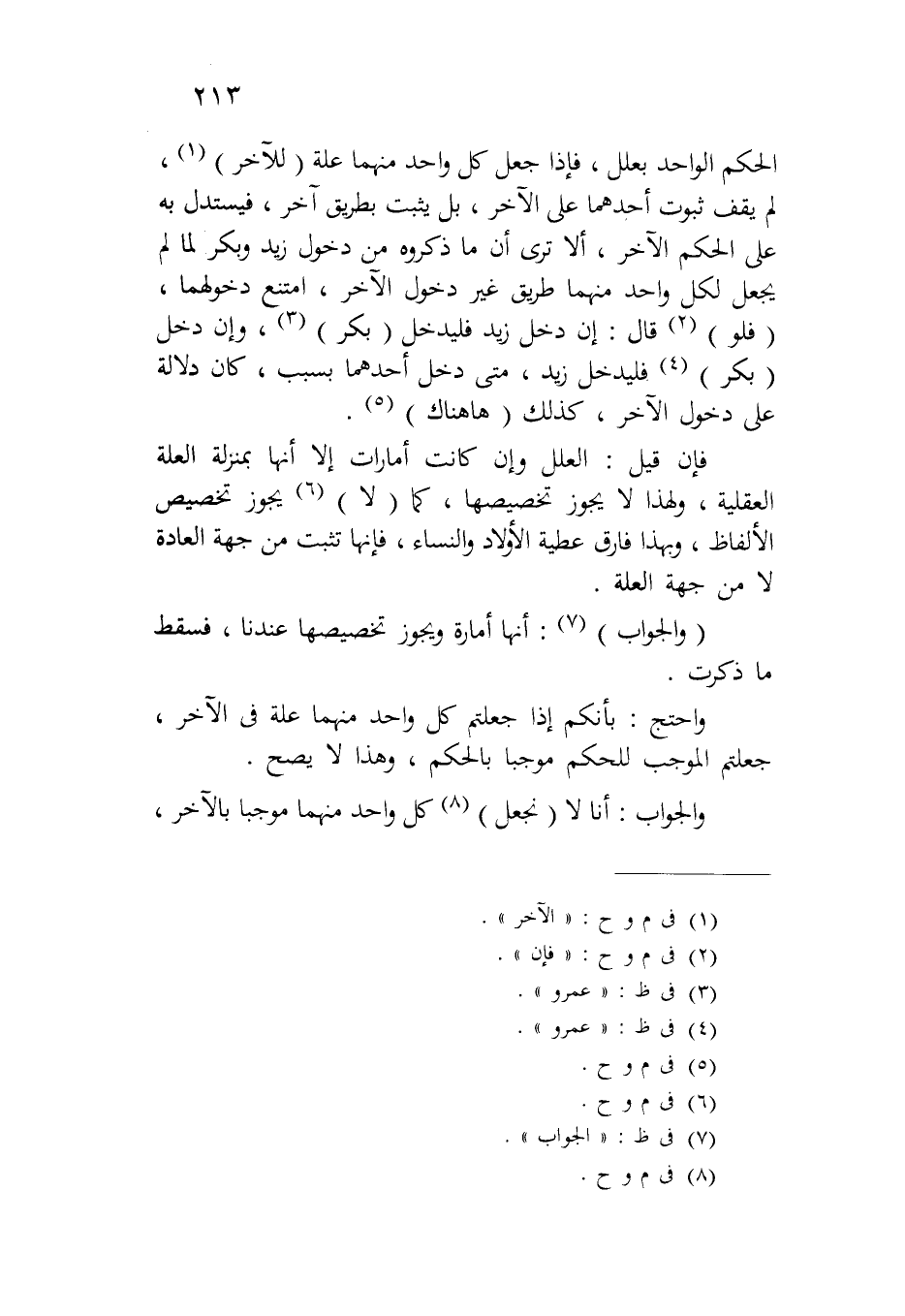 الحكم الواحد بعلل، فإذا جعل كل واحد منهما علة (للآخر)، لم يقف ثبوت أحدهما على الآخر، بل يثبت بطريق آخر، فيستدل به على الحكم الآخر، ألا ترى أن ما ذكروه من دخول زيد وبكر لما لم يجعل لكل واحد منهما طريق غير دخول الآخر، امتنع دخولهما، (فلو) قال: إن دخل زيد فليدخل (بكر)، وإن دخل (بكر) فليدخل زيد، متى دخل أحدهما بسبب، كان دلالة على دخول الآخر، كذلك (ها هناك).