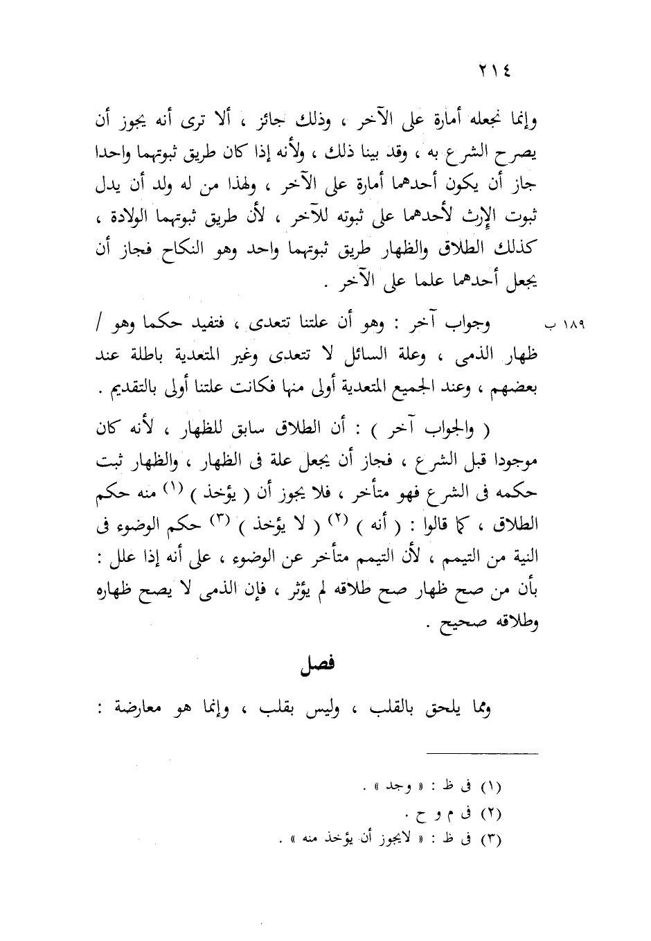 (والجواب آخر): أن الطلاق سابق للظهار، لأنه كان موجوداً قبل الشرع، فجاز أن يجعل علة في الظهار، والظهار ثبت حكمه في الشرع فهو متأخر، فلا يجوز أن (يؤخذ) منه حكم الطلاق، كما قالوا: (أنه) (لا يؤخذ) حكم الوضوء في النية من التيمم، لأن التيمم متأخر عن الوضوء، على أنه إذا علل: بأن من صح ظهار صح طلاقه لم يؤثر، فإن الذمي لا يصح ظهاره وطلاقه صحيح.