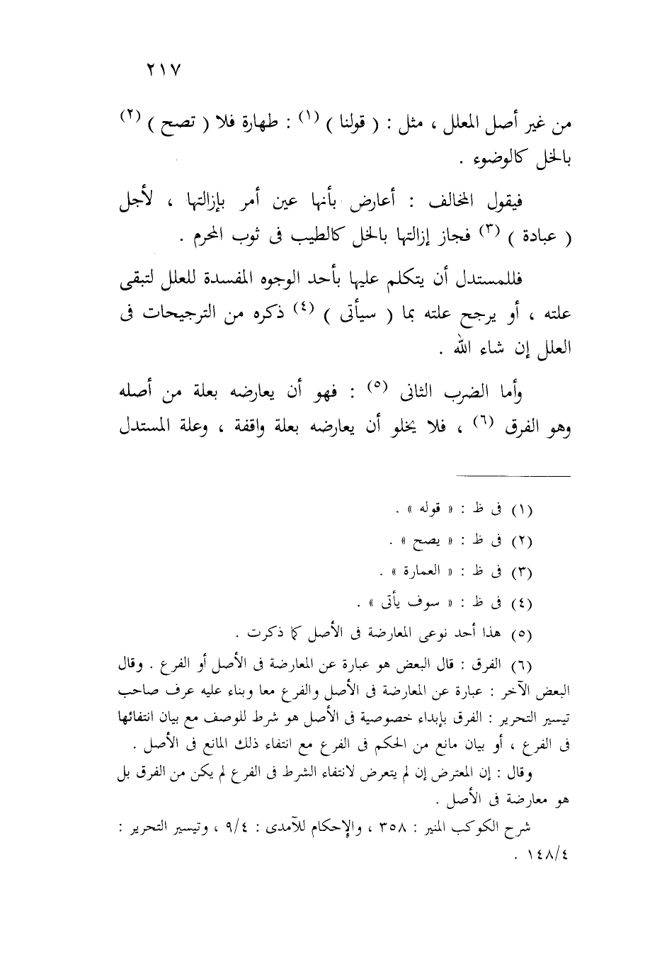 فللمستدل أن يتكلم عليها بأحد الوجوه المفسدة للعلل لتبقى علته، أو يرجح علته بما (سيأتي) ذكره من الترجيحات في العلل إن شاء الله.