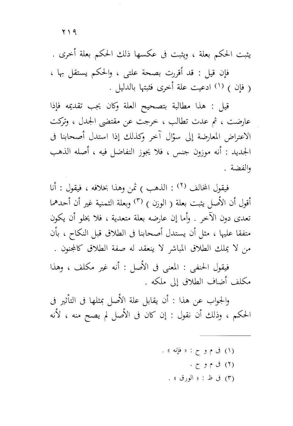 فيقول المخالف: الذهب) ثمن وهذا بخلافه، فيقول: أنا أقول أن الأصل يثبت بعلة (الوزن) وبعلة الثمنية غير أن أحدهما تعدى دون الآخر. وأما إن عارضه بعلة متعدية، فلا يخلو أن يكون متفقاً عليها، مثل أن يستدل أصحابنا في الطلاق قبل النكاح، بأن من لا يملك الطلاق المباشر لا ينعقد له صفة الطلاق كالمجنون.