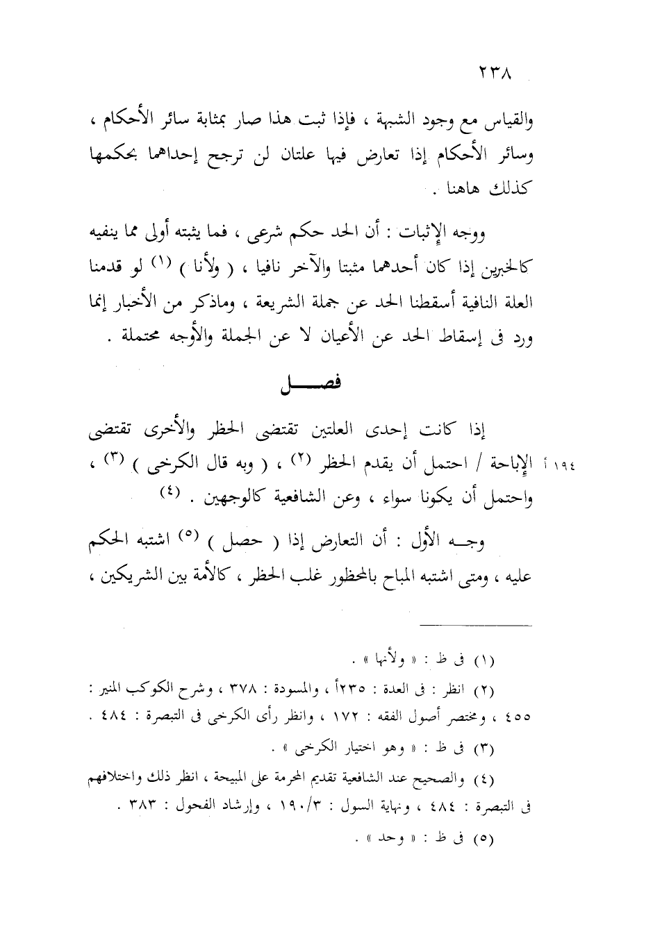 إذا كانت إحدى العلتين تقتضي الحظر والأخرى تقتضي الإباحة/١٩٤ أاحتمل أن يقدم الحظر، (وبه قال الكرخي)، واحتمل أن يكونا سواء، وعن الشافعية كالوجهين.