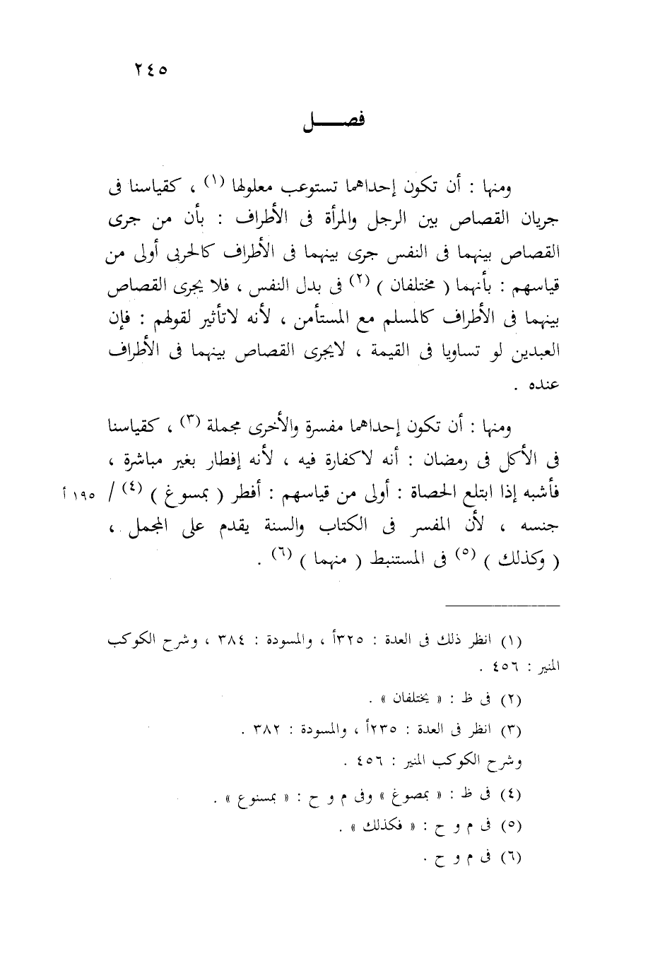 ومنها: أن تكون إحداهما مفسرة والأخرى مجملة، كقياسنا في الأكل في رمضان: أنه لا كفارة فيه، لأنه إفطار بغير مباشرة، فأشبه إذا ابتلع الحصاة: أولى من قياسهم: أفطر (بمسوغ) /١٩٥ أجنسه، لأن المفسر في الكتاب والسنة يقدم على المجمل (وكذلك) في المستنبط (منهما).