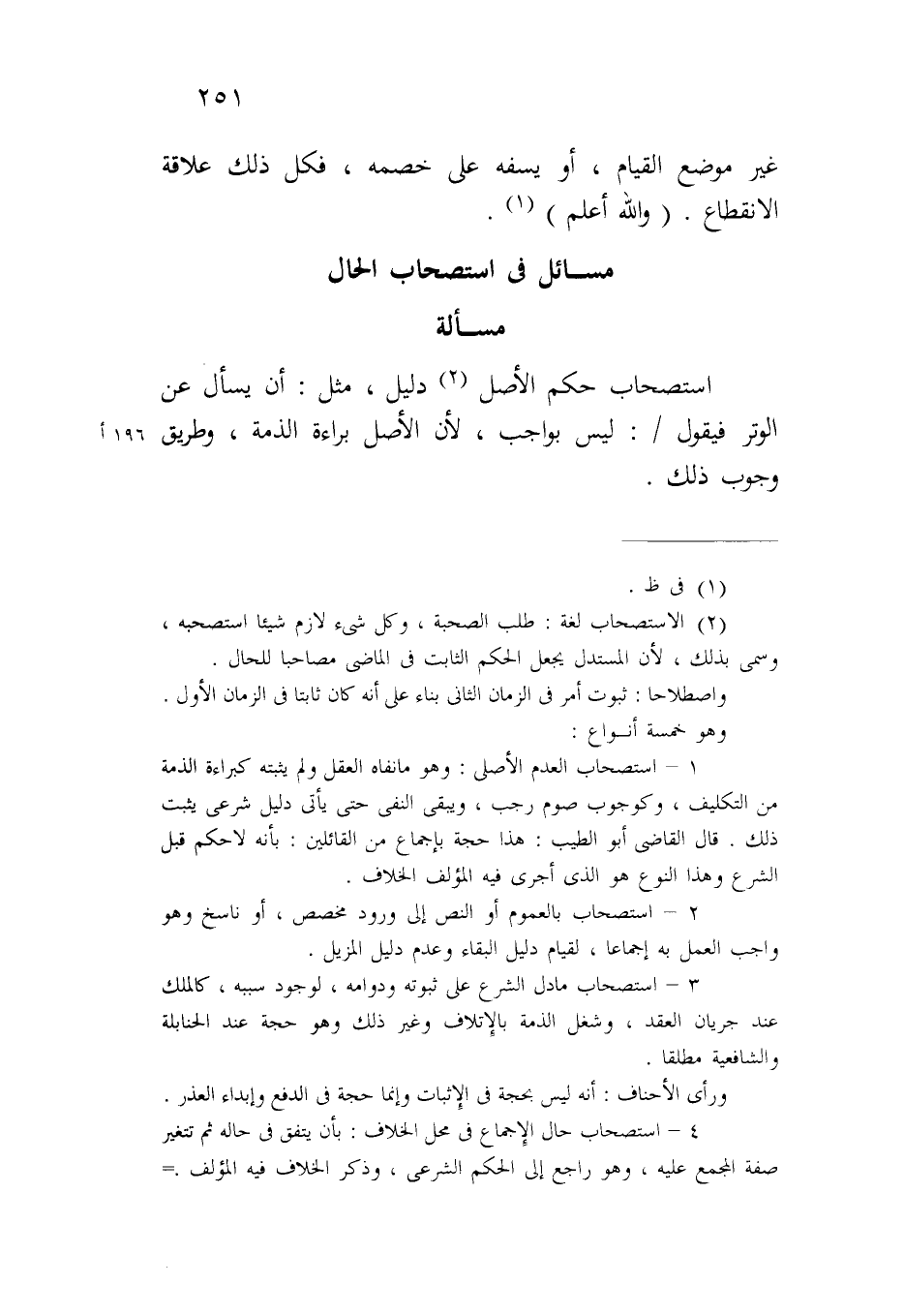 استصحاب حكم الأصل دليل، مثل: أن يسأل عن الوتر فيقول/١٩٦ أ: ليس بواجب، لأن الأصل براءة الذمة، وطريق وجوب ذلك.