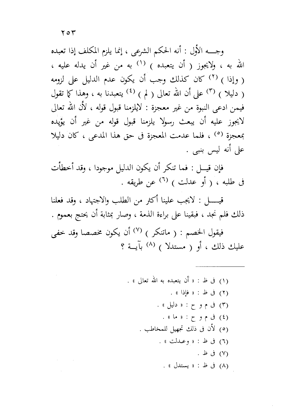 وجه الأول: أنه الحكم الشرعي، إنما يلزم المكلف إذا تعبده الله به، ولا يجوز (أن يتعبده) به من غير أن يدله عليه، (وإذا) كان كذلك وجب أن يكون عدم الدليل على لزومه (دليلاً) على أن الله تعالى (لم) يتعبدنا به، وهذا كما تقول فيمن ادعى النبوة من غير معجزة: لا يلزمنا قبول قوله، لأن الله تعالى لا يجوز عليه أن يبعث رسولاً يلزمنا قبول قوله من غير أن يؤيده بمعجزة، فلما عدمت المعجزة في حق هذا المدعي، كان دليلاً على أنه ليس ينبي.