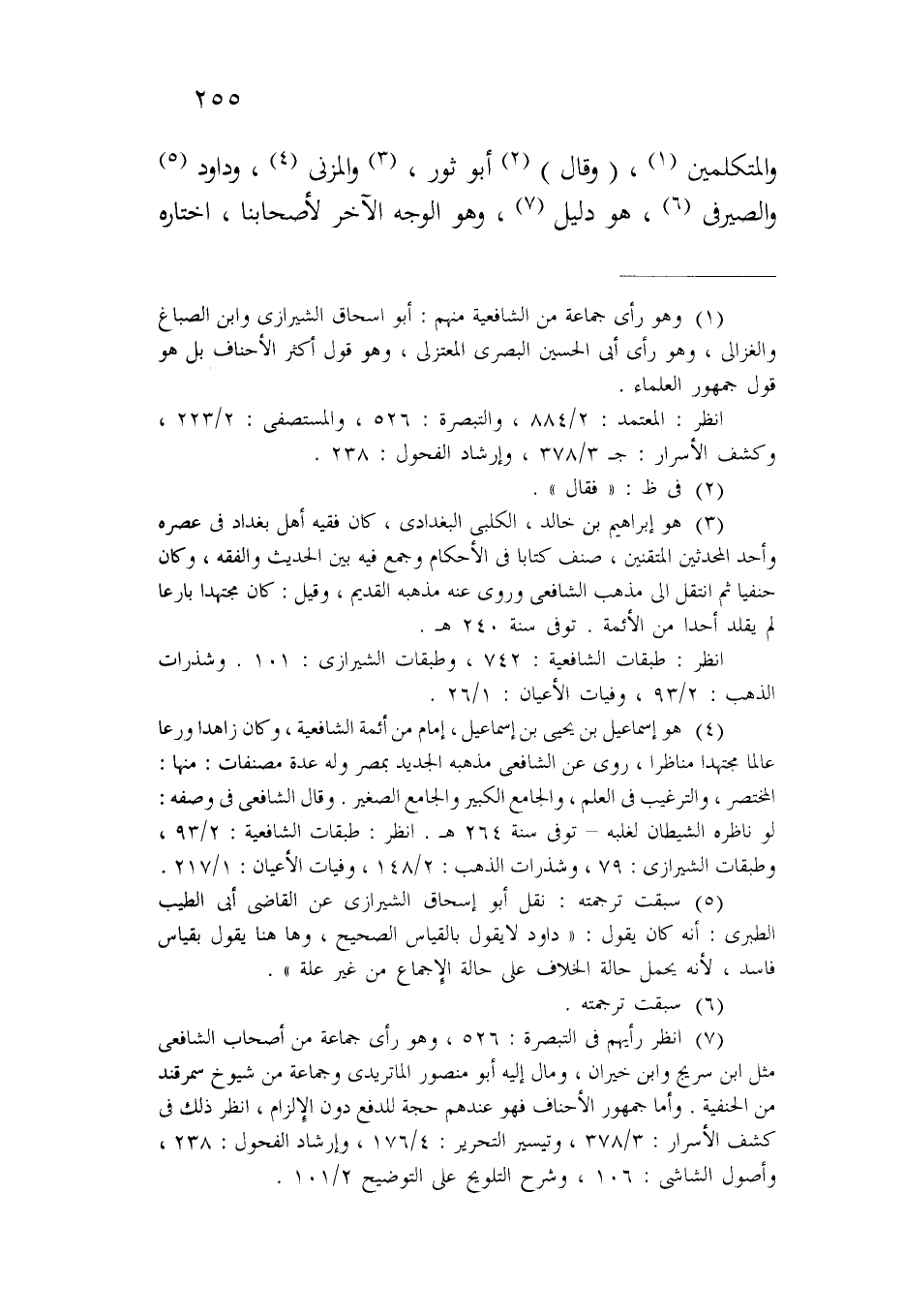 والمتكلمين، (وقال) أبو ثور، والمزني، وداود والصيرفي، هو دليل، وهو الوجه الآخر لأصحابنا، اختاره