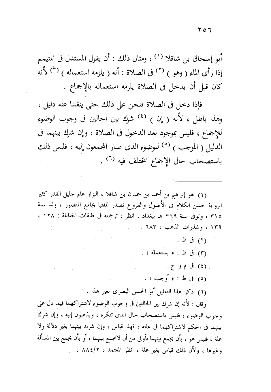 أبو إسحاق بن شاقلا، ومثال ذلك: أن يقول المستدل في المتيمم إذا رأى الماء (وهو) في الصلاة: أنه (يلزمه استعماله) لأنه كان قبل أن يدخل في الصلاة يلزمه استعماله بالإجماع.