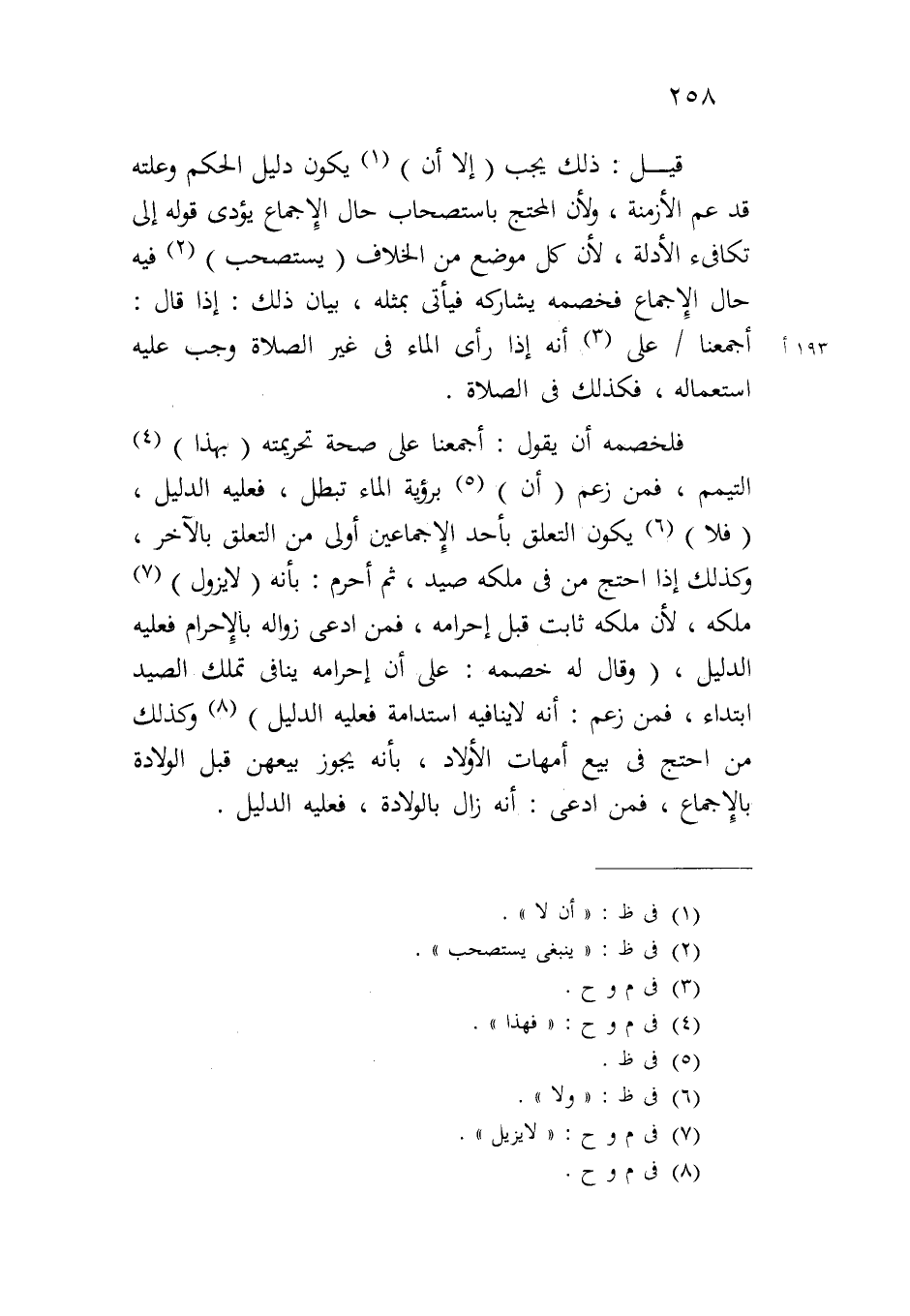 فلخصمه أن يقول: أجمعنا على صحة تحريمته (بهذا) التيمم، فمن زعم (أن) برؤية الماء تبطل، فعليه الدليل، (فلا) يكون التعلق بأحد الإجماعين أولى من التعلق بالآخر، وكذلك إذا احتج من في ملكه صيد، ثم أحرم: بأنه (لا يزول) ملكه، لأن ملكه ثابت قبل إحرامه، فمن ادعى زواله بالإحرام فعليه الدليل، (وقال له خصمه: على أن إحرامه ينافي تملك الصيد ابتداء، فمن زعم: أنه لا ينافيه استدامة فعليه الدليل) وكذلك من احتج في بيع أمهات الأولاد، بأنه يجوز بيعهن قبل الولادة بالإجماع، فمن ادعى: أنه زال بالولادة، فعليه الدليل.