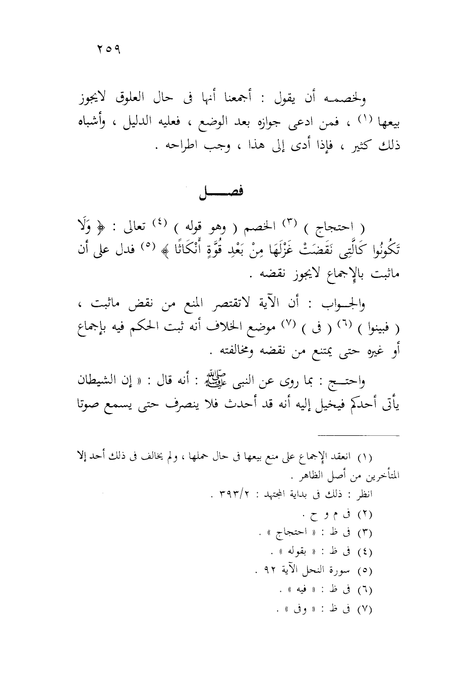 (احتجاج) الخصم (وهو قوله) تعالى: {وَلا تَكُونُوا كَالَّتِي نَقَضَتْ غَزْلَهَا مِنْ بَعْدِ قُوَّةٍ أَنكَاثاً} فدل على أن ما ثبت بالإجماع لا يجوز نقضه.