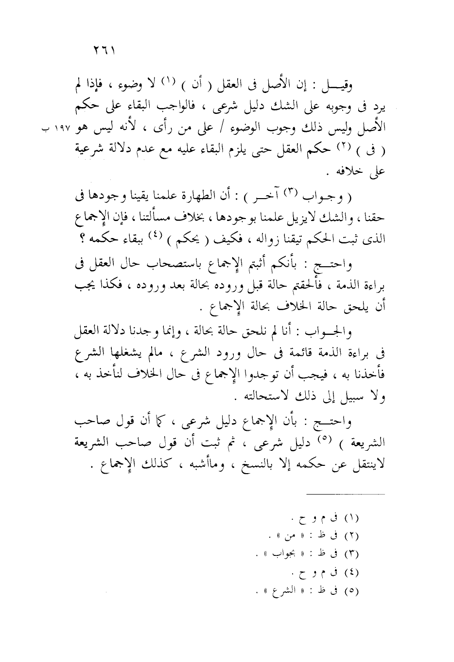 وقيل: إن الأصل في العقل (أن) لا وضوء، فإذا لم يرد في وجوبه على الشك دليل شرعي، فالواجب البقاء على حكم الأصل وليس ذلك وجوب الوضوء/١٩٧ ب على من رأى، لأنه ليس هو (في) حكم العقل حتى يلزم البقاء عليه مع عدم دلالة شرعية على خلافه.