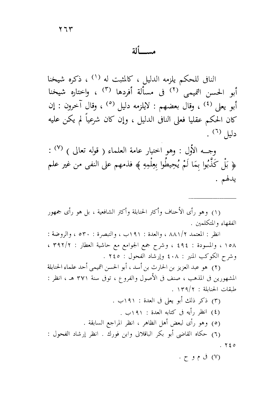 النافي للحكم يلزمه الدليل، كالمثبت له، ذكره شيخنا أبو الحسن التميمي في مسألة أفردها، واختاره شيخنا أبو يعلي، وقال بعضهم: لا يلزمه دليل، وقال آخرون: إن كان الحكم عقلياً فعلى النافي الدليل، وإن كان شرعياً لم يكن عليه دليل.
