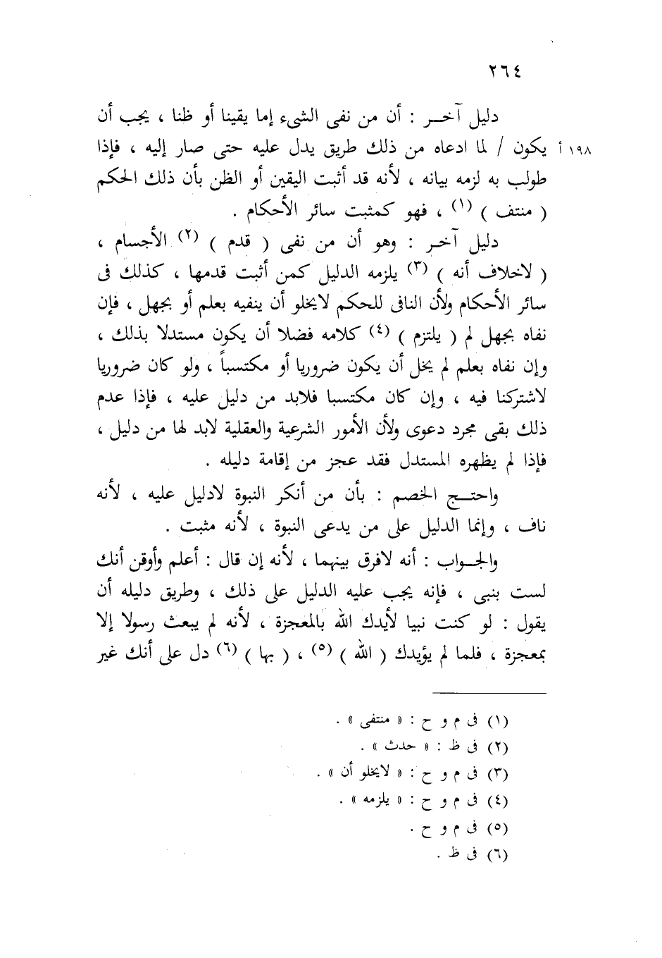 دليل آخر: وهو أن من نفي (قدم) الأجسام، (لا خلاف أنه) يلزمه الدليل كمن أثبت قدمها، كذلك في سائر الأحكام ولأن النافي للحكم لا يخلو أن ينفيه بعلم أو بجهل، فإن نفاه بجهل لم (يلتزم) كلامه فضلاً أن يكون مستدلاً بذلك، وإن نفاه بعلم لم يخل أن يكون ضرورياً أو مكتسباً، ولو كان ضرورياً لاشتركنا فيه، وإن كان مكتسباً فلابد من دليل عليه، فإذا عدم ذلك بقى مجرد دعوى ولأن الأمور الشرعية والعقلية لابد لها من دليل، فإذا لم يظهره المستدل فقد عجز من إقامة دليله.