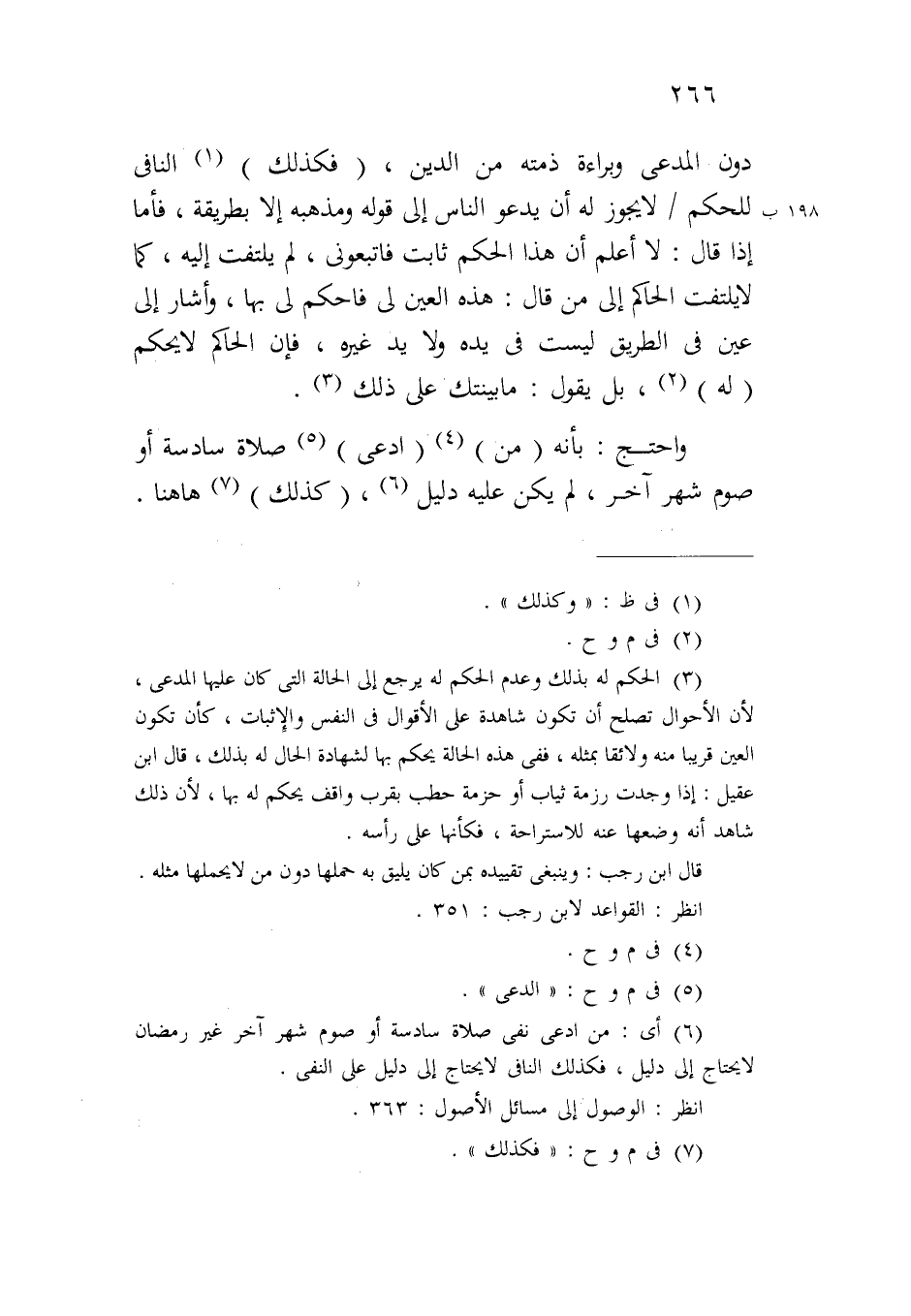 دون المدعي وبراءة ذمته من الدين، (فكذلك) النافي للحكم/١٩٨ ب لا يجوز له أن يدعو الناس إلى قوله ومذهبه إلا بطريقة، فأما إذا قال: لا أعلم أن هذا الحكم ثابت فاتبعوني، لم يلتفت إليه، كما لا يلتفت الحاكم إلى من قال: هذه العين لي فاحكم لي بها، وأشار إلى عين في الطريق ليست في يده ولا يد غيره، فإن الحاكم لا يحكم (له)، بل يقول: ما بينتك على ذلك.