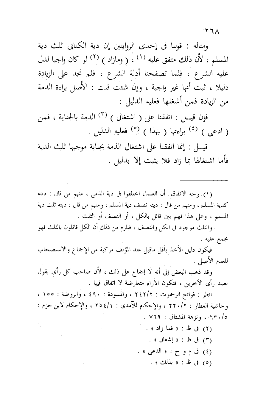 ومثاله: قولنا في إحدى الروايتين إن دية الكتابي ثلث دية المسلم، لأن ذلك متفق عليه، (وما زاد) لو كان واجباً لدل عليه الشرع، فلما تصفحنا أدلة الشرع، فلم نجد على الزيادة دليلاً، ثبت أنها غير واجبة، وإن شئت قلت: الأصل براءة الذمة من الزيادة فمن أشغلها فعليه الدليل:
