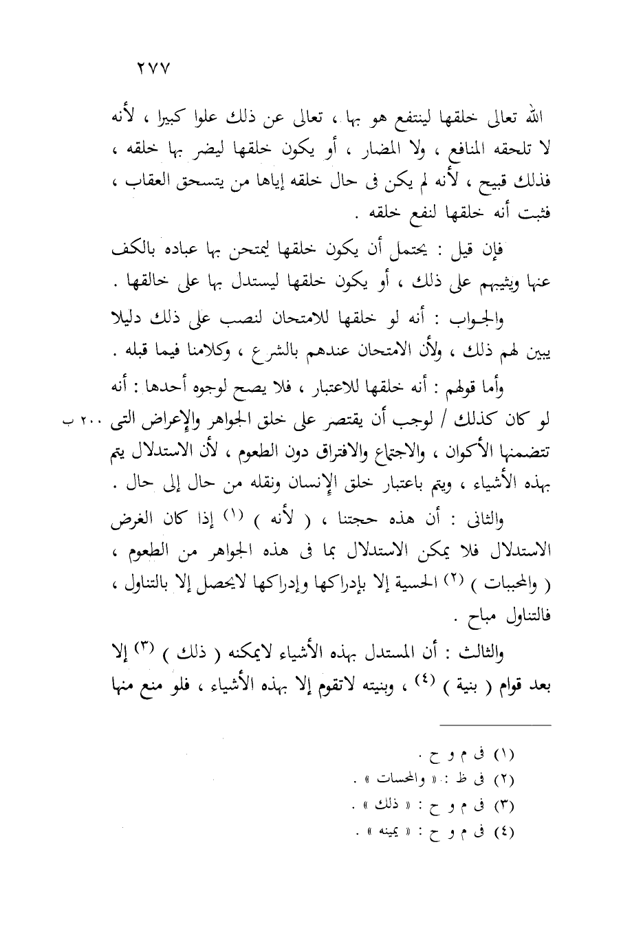 وأما قولهم: أنه خلقها للاعتبار، فلا يصح لوجوه أحدها: أنه لو كان كذلك/٢٠٠ ب لوجب أن يقتصر على خلق الجواهر والإعراض التي تتضمنها الأكوان، والاجتماع والافتراق دون الطعوم، لأن الاستدلال يتم بهذه الأشياء، ويتم باعتبار خلق الإنسان ونقله من حال إلى حال.