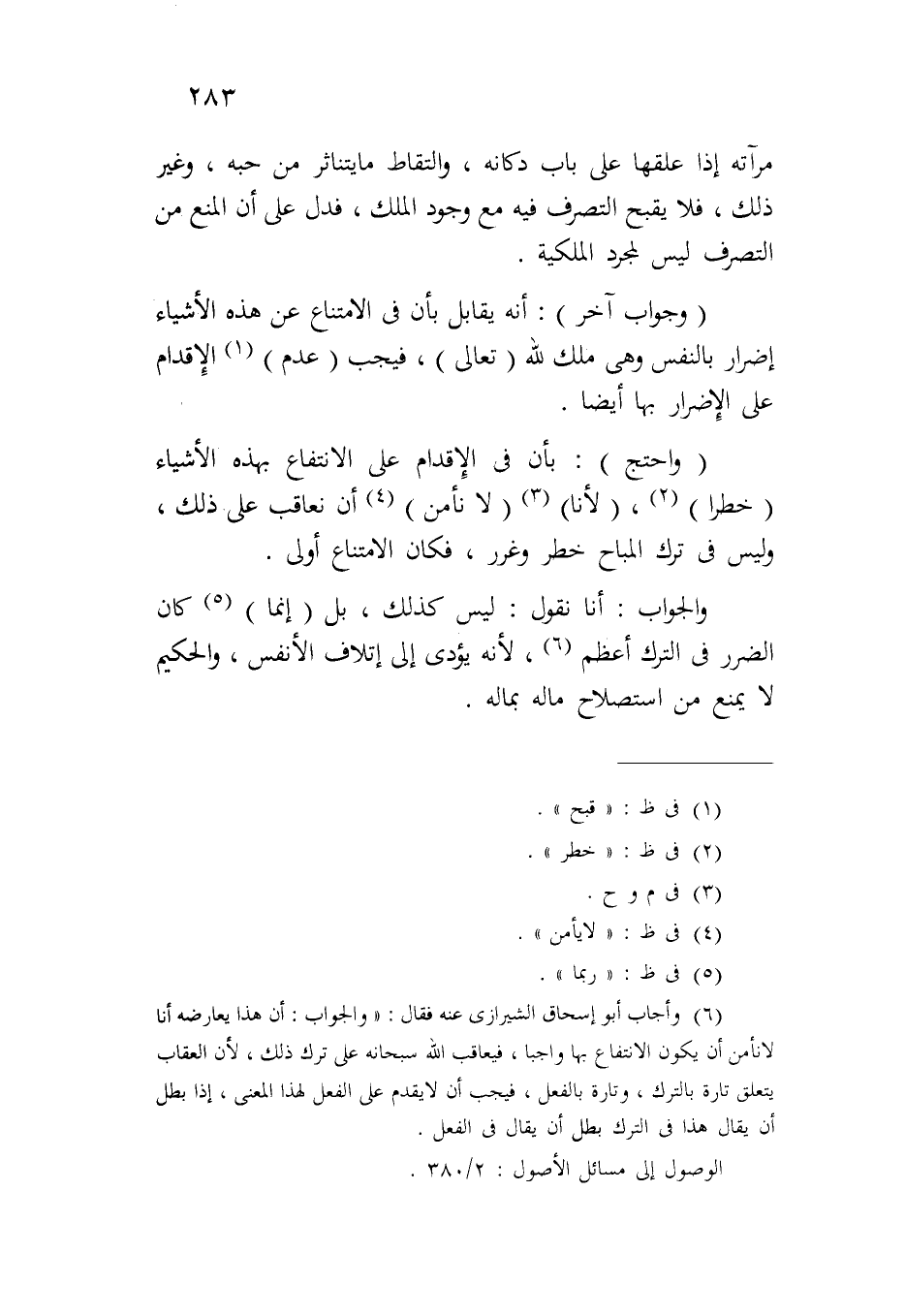 (وجواب آخر): أنه يقابل بأن في الامتناع عن هذه الأشياء إضرار بالنفس وهي ملك لله (تعالى)، فيجب (عدم) الإقدام على الإضرار بها أيضاً.