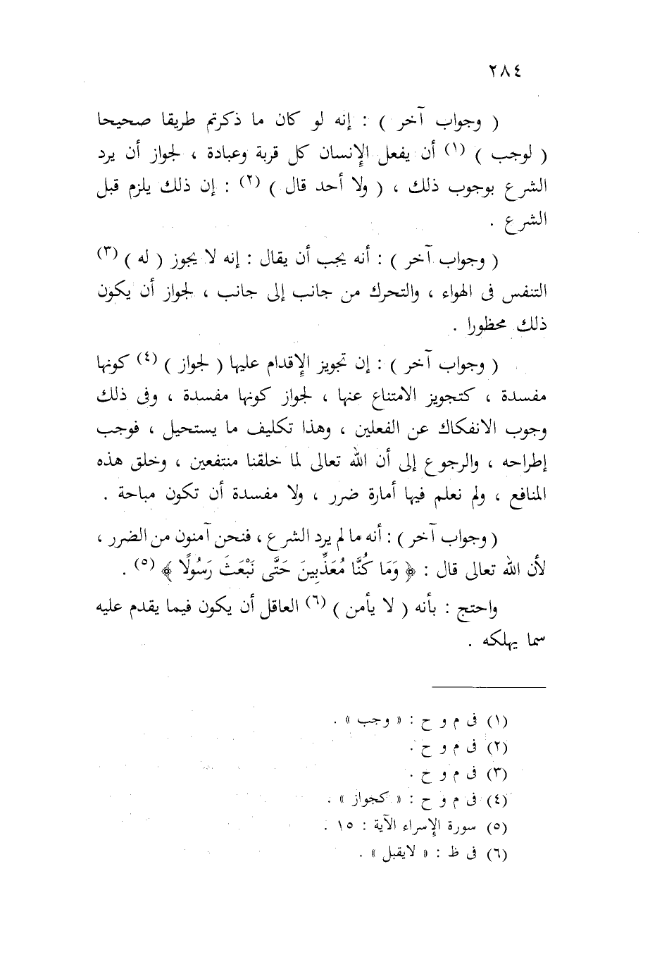 (وجواب آخر): إنه لو كان ما ذكرتم طريقاً صحيحاً (لوجب) أن يفعل الإنسان كل قربة وعبادة، لجواز أن يرد الشرع بوجوب ذلك، (ولا أحد قال): إن ذلك يلزم قبل الشرع.