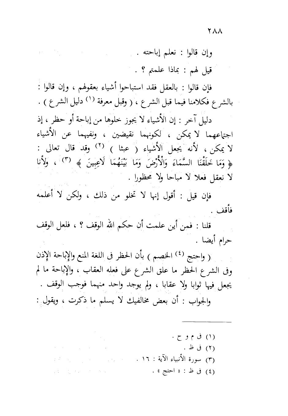دليل آخر: إن الأشياء لا يجوز خلوها من إباحة أو حظر، إذ اجتماعهما لا يمكن، لكونهما نقيضين، ونفيهما عن الأشياء لا يمكن، لأنه يجعل الأشياء (عبثاً) وقد قال تعالى: {وَمَا خَلَقْنَا السَّمَاءَ وَالأَرْضَ وَمَا بَيْنَهُمَا لاعِبِينَ}، ولأنا لا نعقل فعلاً لا مباحاً ولا محظوراً.