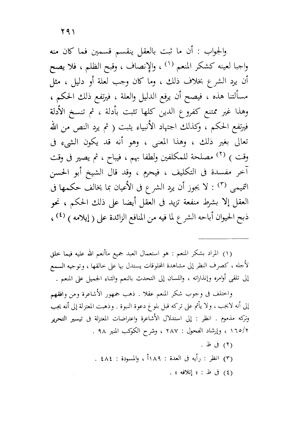 والجواب: أن ما ثبت بالعقل ينقسم قسمين فما كان منه واجباً لعينه كشكر المنعم، والإنصاف، وقبح الظلم، فلا يصح أن يرد الشرع بخلاف ذلك، وما كان وجب لعلة أو دليل، مثل مسألتنا هذه، فيصح أن يرفع الدليل والعلة، فيرتفع ذلك الحكم، وهذا غير ممتنع كفروع الدين كلها تثبت بأدلة، ثم تنسخ الأدلة فيرتفع الحكم، وكذلك اجتهاد الأنبياء يثبت (ثم يرد النص من الله تعالى بغير ذلك، وهذا المعنى، وهو أنه قد يكون الشيء في وقت) مصلحة للمكلفين ولطفاً بهم، فيباح، ثم يصير في وقت آخر مفسدة في التكليف، فيحرم، وقد قال الشيخ أبو الحسن التميمي: لا يجوز أن يرد الشرع في الأعيان بما يخالف حكمها في العقل إلا بشرط منفعة تزيد في العقل أيضاً على ذلك الحكم، نحو ذبح الحيوان أباحه الشرع لما فيه من المنافع الزائدة على (إيلامه)،
