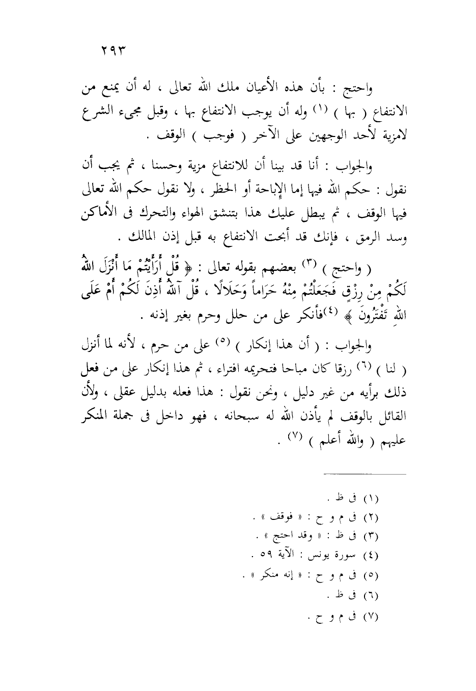 (واحتج) بعضهم بقوله تعالى: {قُلْ أَرَأَيْتُمْ مَا أَنْزَلَ اللَّهُ لَكُمْ مِنْ رِزْقٍ فَجَعَلْتُمْ مِنْهُ حَرَاماً وَحَلالاً قُلْ أَاللَّهُ أَذِنَ لَكُمْ أَمْ عَلَى اللَّهِ تَفْتَرُونَ} فأنكر على من حلل وحرم بغير إذنه.