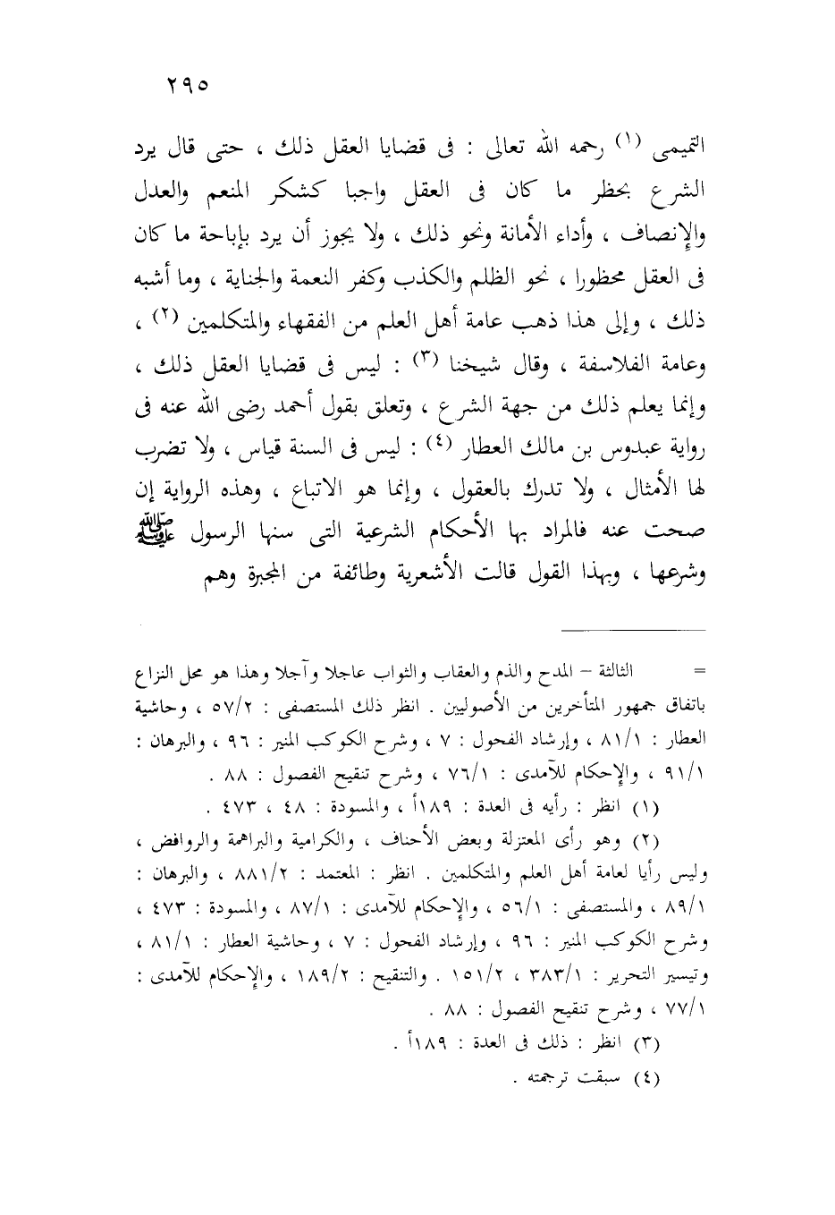 التميمي رحمه الله تعالى: في قضايا العقل ذلك، حتى قال يرد الشرع بحظر ما كان في العقل واجباً كشكر المنعم والعدل والإنصاف، وأداء الأمانة ونحو ذلك، ولا يجوز أن يرد بإباحة ما كان في العقل محظوراً، نحو الظلم والكذب وكفر النعمة والجناية، وما أشبه ذلك، وإلى هذا ذهب عامة أهل العلم من الفقهاء والمتكلمين، وعامة الفلاسفة، وقال شيخنا: ليس في قضايا العقل ذلك، وإنما يعلم ذلك من جهة الشرع، وتعلق بقول أحمد رضي الله عنه في رواية عبدوس بن مالك العطار: ليس في السنة قياس، ولا تضرب لها الأمثال، ولا تدرك بالعقول، وإنما هو الاتباع، وهذه الرواية إن صحت عنه فالمراد بها الأحكام الشرعية التي سنها الرسول صلى الله عليه وسلم وشرعها، وبهذا القول قالت الأشعرية وطائفة من المجبرة وهم.