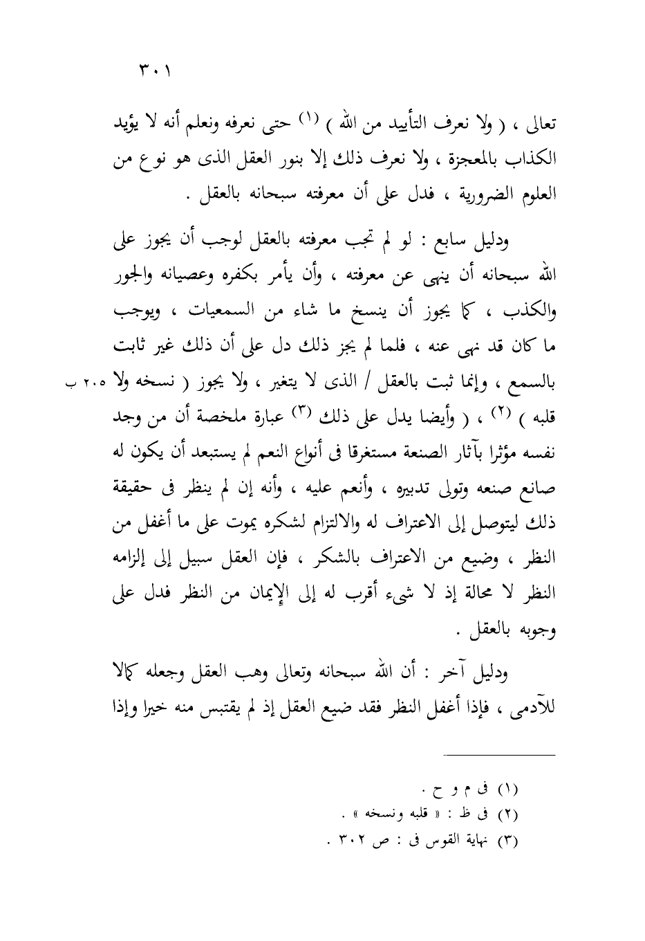 ودليل سابع: لو لم تجب معرفته بالعقل لوجب أن يجوز على الله سبحانه أن ينهى عن معرفته، وأن يأمر بكفره وعصيانه والجور والكذب، كما يجوز أن ينسخ ما شاء من السمعيات، ويوجب ما كان قد نهي عنه، فلما لم يجز ذلك دل على أن ذلك غير ثابت بالسمع، وإنما ثبت بالعقل/٢٠٥ ب الذي لا يتغير، ولا يجوز (نسخه ولا قلبه)، (وأيضاً يدل على ذلك عبارة ملخصة أن من وجد نفسه مؤثراً بآثار الصنعة مستغرقاً في أنواع النعم لم يستبعد أن يكون له صانع صنعه وتولي تدبيره، وأنعم عليه، وأنه إن لم ينظر في حقيقة ذلك ليتوصل إلى الاعتراف له والالتزام لشكره يموت على ما أغفل من النظر، وضيع من الاعتراف بالشكر، فإن العقل سبيل إلى إلزامه النظر لا محالة إذ لا شيء أقرب له إلى الإيمان من النظر فدل على وجوبه بالعقل.