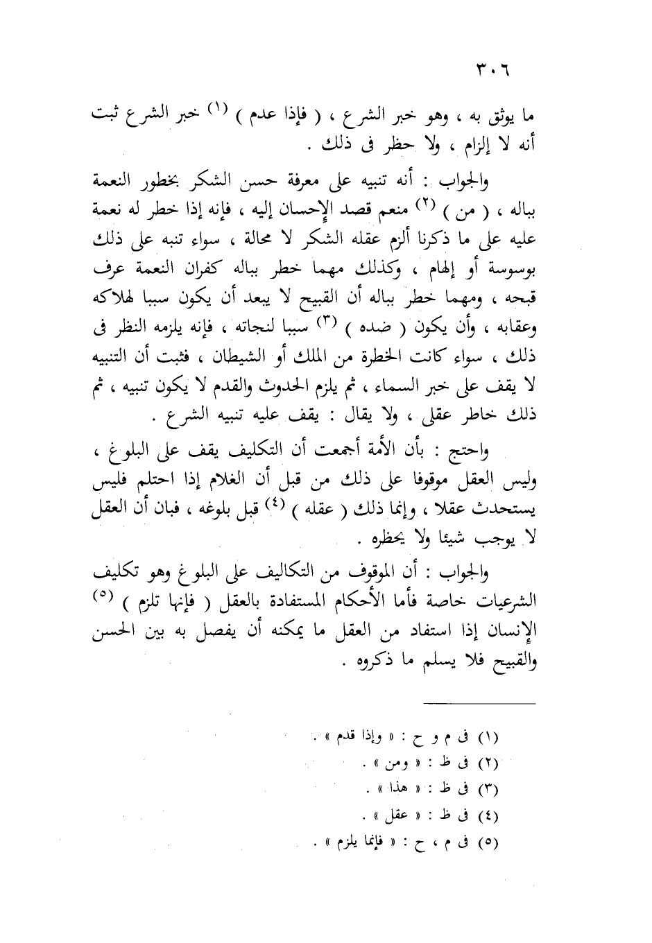 والجواب: أنه تنبيه على معرفة حسن الشكر بخطور النعمة بباله، (من) منعم قصد الإحسان إليه، فإنه إذا خطر له نعمة عليه على ما ذكرنا ألزم عقله الشكر لا محالة، سواء تنبه على ذلك بوسوسة أو إلهام، وكذلك مهما خطر بباله كفران النعمة عرف قبحه، ومهما خطر بباله أن القبيح لا يبعد أن يكون سبباً لهلاكه وعقابه، وأن يكون (ضده) سبباً لنجاته، فإنه يلزمه النظر في ذلك، سواء كانت الخطرة من الملك أو الشيطان، فثبت أن التنبيه لا يقف على خبر السماء، ثم يلزم الحدوث والقدم لا يكون تنبيه، ثم ذلك خاطر عقلي، ولا يقال: يقف عليه تنبيه الشرع.