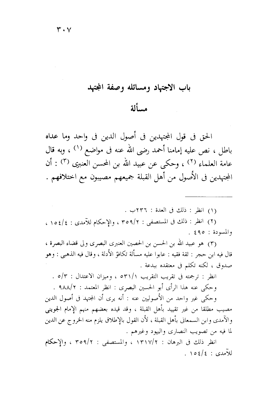 الحق في قول المجتهدين في أصول الدين في واحد وما عداه باطل، نص عليه إمامنا أحمد رضي الله عنه في مواضع، وبه قال عامة العلماء، وحكى عن عبيد الله بن المحسن العنبري: أن المجتهدين في الصول من أهل القبلة جميعهم مصيبون مع اختلافهم.