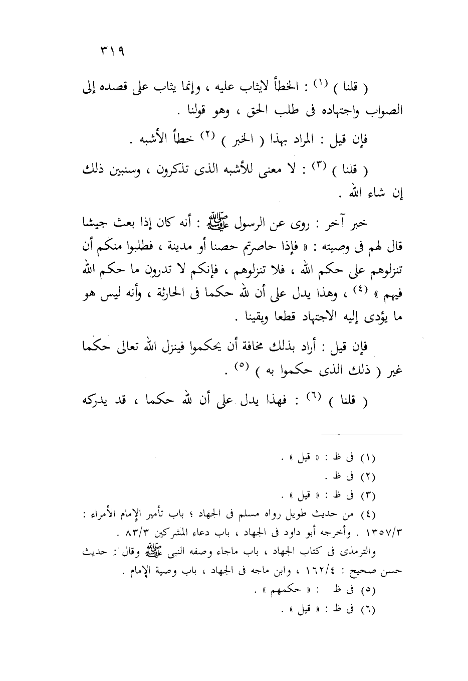خبر آخر: روى عن الرسول صلى الله عليه وسلم: أنه كان إذا بعث جيشاً قال لهم في وصيته: "فإذا حاصرتم حصناً أو مدينة، فطلبوا منكم أن تنزلوهم على حكم الله، فلا تنزلوهم، فإنكم لا تدرون ما حكم الله فيهم"، وهذا يدل على أن لله حكماً في الحارثة، وأنه ليس هو ما يؤدي إليه الاجتهاد قطعاً ويقيناً.
