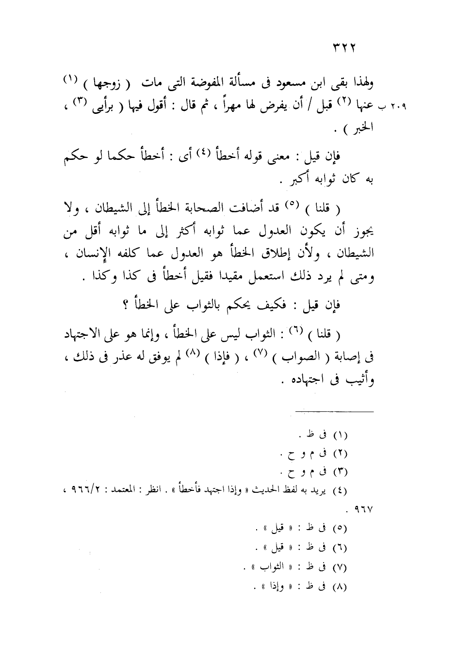 (قلنا) قد أضافت الصحابة الخطأ إلى الشيطان، ولا يجوز أن يكون العدول عما ثوابه أكثر إلى ما ثوابه أقل من الشيطان، ولأن إطلاق الخطأ هو العدول عما كلفه الإنسان، ومتى لم يرد ذلك استعمل مقيداً فقيل أخطأ في كذا وكذا.