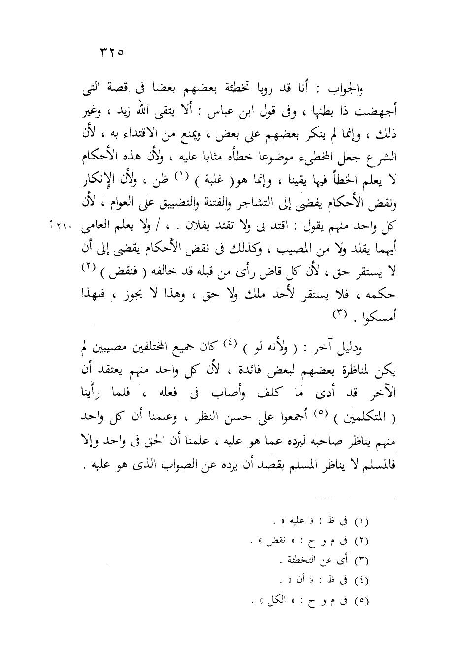 والجواب: أنا قد رويا تخطئة بعضهم بعضاً في قصة التي أجهضت ذا بطنها، وفي قول ابن عباس: ألا يتقي الله زيد، وغير ذلك، وإنما لم ينكر بعضهم على بعض، ويمنع من الاقتداء به، لأن الشرع جعل المخطيء موضوعاً خطأه مثاباً عليه، ولأن هذه الأحكام لا يعلم الخطأ فيها يقينا، وإنما هو (غلبة) ظن، ولأن الإنكار ونقض الأحكام يقضي إلى التشاجر والفتنة والتضييق على العوام، لأن كل واحد منهم يقول: اقتد بي ولا تقتد بفلان،/٢١٠ أولا يعلم العامي أيهما يقلد ولا من المصيب، وكذلك في نقض الأحكام يقضي إلى أن لا يستقر حق، لأن كل قاض رأى من قبله قد خالفه (فنقض) حكمه، فلا يستقر لأحد ملك ولا حق، وهذا لا يجوز، فلهذا أمسكوا.
