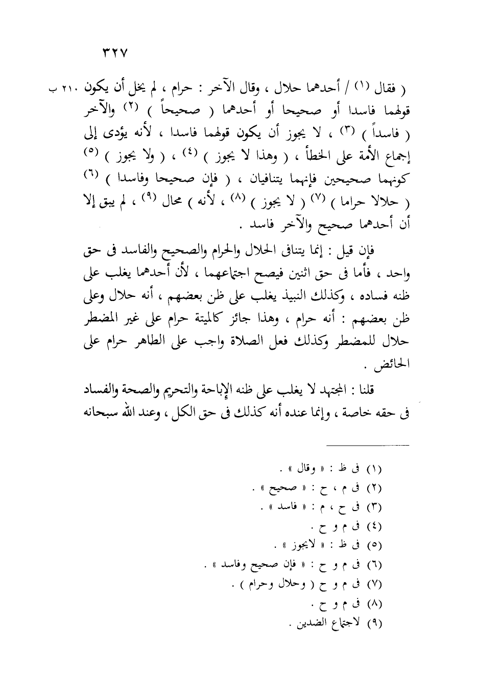 (فقال/٢١٠ ب أحدهما حلال، وقال الآخر: حرام، لم يخل أن يكون قولهما فاسداً أو صحيحاً أو أحدهما (صحيحاً) والآخر (فاسداً)، لا يجوز أن يكون قولهما فاسداً، لأنه يؤدي إلى إجماع الأمة على الخطأ، (وهذا لا يجوز)، (ولا يجوز) كونهما صحيحين فإنهما يتنافيان، (فإن صحيحاً وفاسداً) (حلالاً حراماً) (لا يجوز)، لأنه) محال، لم يبق إلا أن أحدهما صحيح والآخر فاسد.
