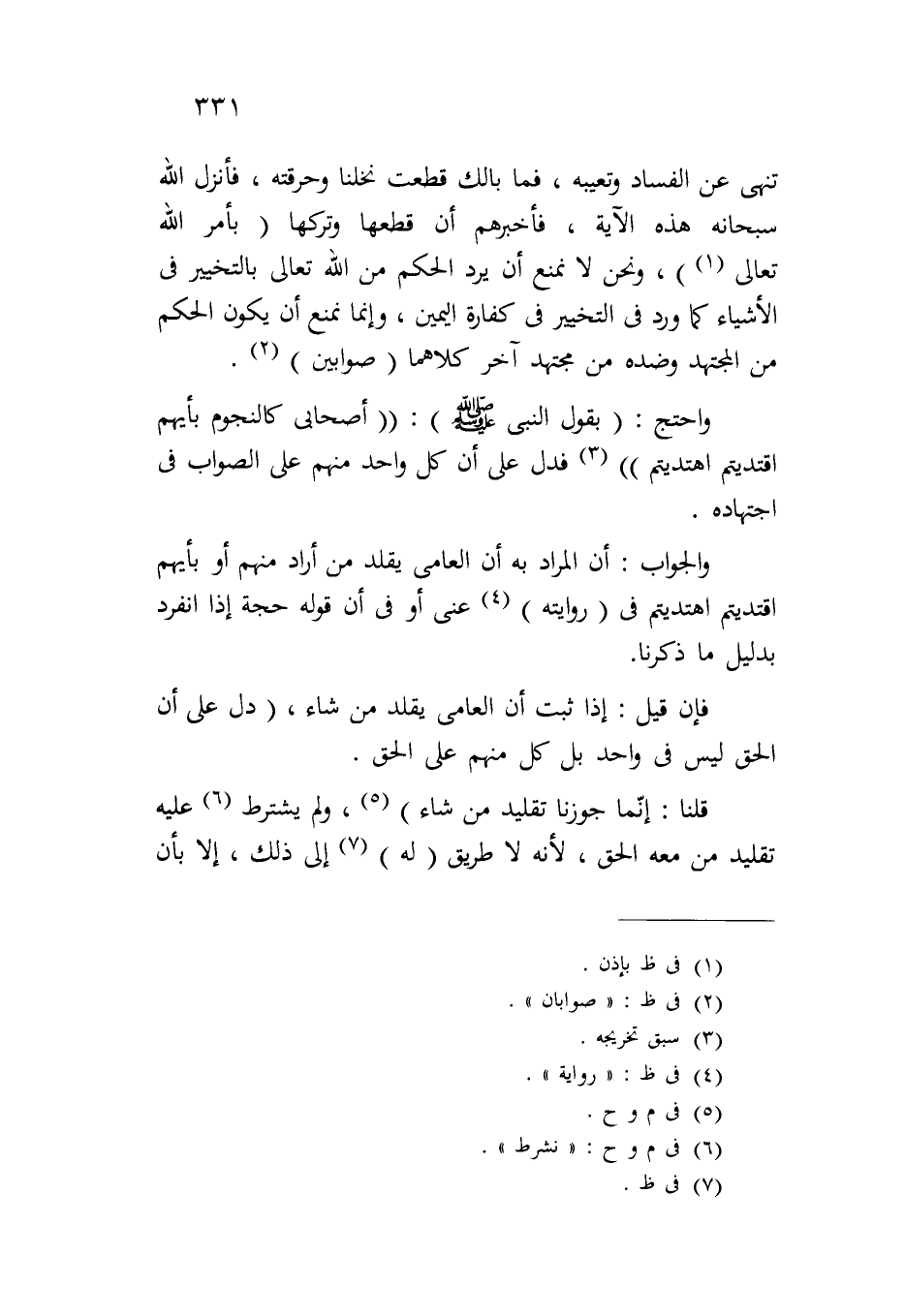 تنهى عن الفساد وتعيبه، فما بالك قطعت نخلنا وحرقته، فأنزل الله سبحانه هذه الآية، فأخبرهم أن قطعها وتركها (بأمر الله تعالى)، ونحن لا نمنع أن يرد الحكم من الله تعالى بالتخيير في الأشياء كما ورد في التخيير في كفارة اليمين، وإنما نمنع أن يكون الحكم من المجتهد وضده من مجتهد آخر كلاهما (صوابين).