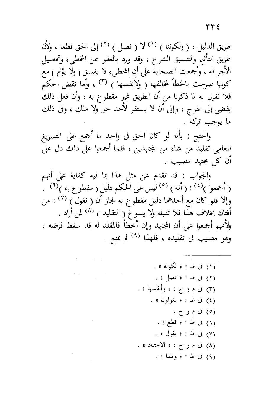 طريق الدليل، (ولكوننا) لا (نصل) إلى الحق قطعاً، ولأن طريق التأثيم والتنسيق الشرع، وقد ورد بالعفو عن المخطيء وتحصيل الأجر له، وأجمعت الصحابة على أن المخطيء لا يفسق [ولا يؤثم] مع كونها صرحت بالخطأ لمخالفها (ولأنفسها)، وأما نقض الحكم فلا نقول به لما ذكرنا من أن الطريق غير مقطوع به، وأن فعل ذلك يفضي إلى الهرج، وإلى أن لا يستقر لأحد حق ولا ملك، وفي ذلك ما يوجب تركه.