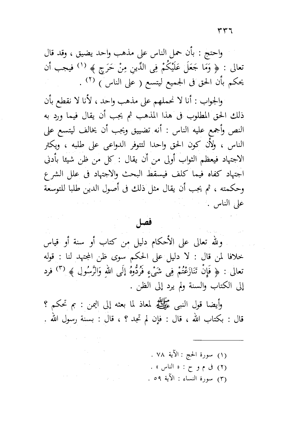 والجواب: أنا لا نحملهم على مذهب واحد، لأنا لا نقطع بأن ذلك الحق المطلوب في هذا المذهب ثم يجب أن يقال فيما ورد به النص وأجمع عليه الناس: أنه تضييق ويجب أن يخالف ليتسع على الناس، ولأن كون الحق واحداً لتتوفر الدواعي على طلبه، ويكثر الاجتهاد فيعظم الثواب أولى من أن يقال: كل من ظن شيئاً بأدنى اجتهاد كفاه فيما كلف فيسقط البحث والاجتهاد في علل الشرع وحكمته، ثم يجب أن يقال مثل ذلك في أصول الدين طلبا للتوسعة على الناس.