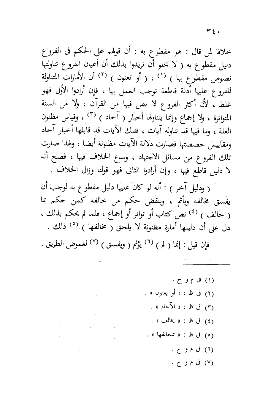 خلافاً لمن قال: هو مقطوع به: أن قولهم على الحكم في الفروع دليل مقطوع به (لا يخلو أن تريدوا بذلك أن أعيان الفروع تناولتها نصوص مقطوع بها)، (أو تعنون) أن الأمارات المتناولة للفروع عليها أدلة قاطعة توجب العمل بها، فإن أرادوا الأول فهو غلط، لأن أكثر الفروع لا نص فيها من القرآن، ولا من السنة المتواترة، ولا إجماع وإنما يتناولها أخبار (آحاد)، وقياس مظنون العلة، وما فيها قد تناوله آيات، فتلك الآيات قد قابلها أخبار آحاد ومقاييس خصصتها فصارت دلالة الآيات مظنونة أيضاً، ولهذا صارت تلك الفروع من مسائل الاجتهاد، وساغ الخلاف فيها، فصح أنه لا دليل قاطع فيها، وإن أرادوا الثاني فهو قولنا وزال الخلاف.