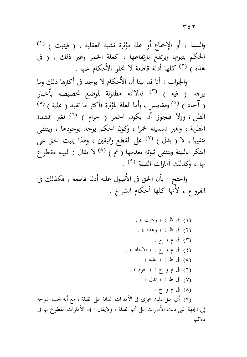 والجواب: أنا قد بينا أن الأحكام لا يوجد في أكثرها ذلك وما يوجد (فيه) فدلالته مظنونة لموضع تخصيصه بأخبار (آحاد) ومقاييس، وأما العلة المؤثرة فأكثر ما تفيد (غلبة) الظن؛ وإلا فيجوز أن يكون الخمر (حرام) لغير الشدة المطربة، ولغير تسميته خمراً، وكون الحكم يوجد بوجودها، وينتفي بنفيها، لا (يدل) على القطع واليقين، ولهذا يثبت الحق على المنكر بالبينة وينتفي ثبوته بعدمها (ثم) لا يقال: البينة مقطوع بها، وكذلك أمارات القبلة.
