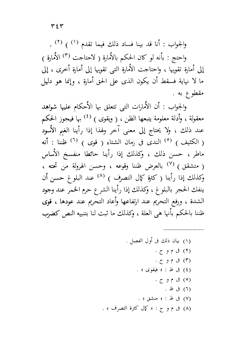 والجواب: أن الأمارات التي تتعلق بها الأحكام عليها شواهد معقولة، وأدلة معلومة يتبعها الظن، (ويقوى) بها فيجوز الحكم عند ذلك، ولا يحتاج إلى معنى آخر ولهذا إذا رأينا الغيم الأسود (الكثيف) الندى في زمان الشتاء (قوى) ظننا: أنه ماطر، حسن ذلك، وكذلك إذا رأينا حائطاً منفسخ الأساس (متشقق) بالعرض ظننا وقوعه، وحسن الهرولة من تحته، وكذلك إذا رأينا (كثرة كمال التصرف) عند البلوغ حسن أن ينفك الحجر بالبلوغ، وكذلك إذا رأينا الشرع حرم الخمر عند وجود الشدة، ورفع التحريم عند ارتفاعها وأعاد التحريم عند عودها، قوى ظننا بالحكم بأنها هي العلة، وكذلك ما ثبت لنا بتنبيه النص كضرب