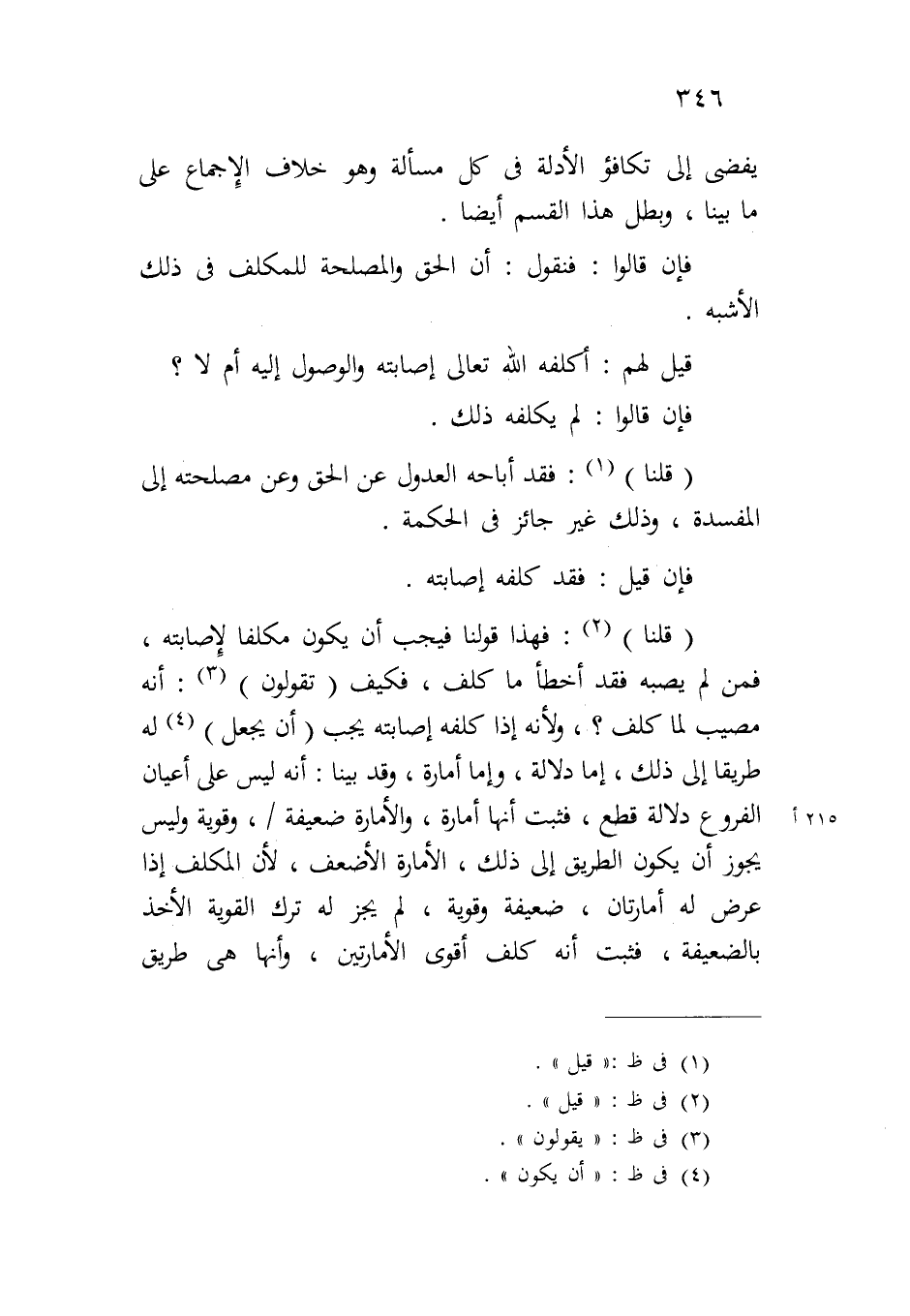 (قلنا): فهذا قولنا فيجب أن يكون مكلفاً لإصابته، فمن لم يصبه فقد أخطأ ما كلف، فكيف (تقولون): أنه مصيب لما كلف؟، ولأنه إذا كلفه إصابته يجب (أن يجعل) له طريقاً إلى ذلك، إما دلالة، وإما أمارة، وقد بينا: أنه ليس على أعيان الفروع دلالة قطع، فثبت أنها أمارة، والأمارة ضعيفة/٢١٥ أ، وقوية وليس يجوز أن يكون الطريق إلى ذلك، الأمارة الأضعف، لأن المكلف إذا عرض له أمارتان، ضعيفة وقوية، لم يجز له ترك القوية الأخذ بالضعيفة، فثبت أنه كلف أقوى الأمارتين، وأنها هي طريق