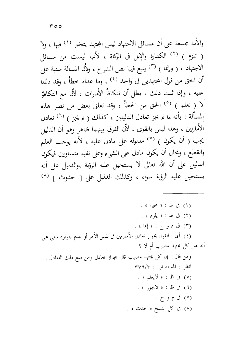 والأمة مجمعة على أن مسائل الاجتهاد ليس المجتهد يتخير فيها، ولا (تلزم) الكفارة والإبل في الزكاة، لأنها ليست من مسائل الاجتهاد، (وإنما) يتبع فيها نص الشرع، ولأن المسألة مبنية على أن الحق من قول المجتهدين في واحد، وما عداه خطأ، وقد دللنا عليه، وإذا ثبت ذلك، بطل أن تتكافأ الأمارات، لأن مع التكافؤ لا (نعلم) الحق من الخطأ، وقد تعلق بعض من نصر هذه المسألة: بأنه لما لم يجز تعادل الدليلين، كذلك (لم يجز) تعادل الأمارتين، وهذا ليس بالقوى، لأن الفرق بينهما ظاهر وهو أن الدليل يجب (أن يكون) مدلوله على ما دل عليه، لأنه يوجب العلم والقطع، ومحال أن يكون ما دل على الشيء وعلى نفيه متساويين فيكون الدليل على أن الله تعالى لا يستحيل عليه الرؤية، والدليل على أنه يستحيل عليه الرؤية سواء، وكذلك الدليل على [حدوث]