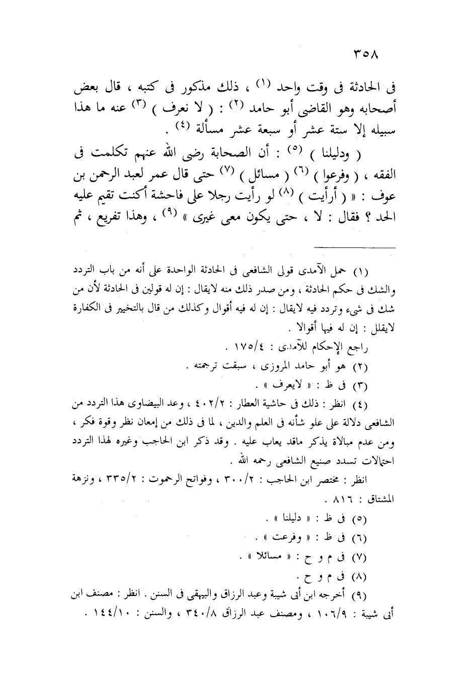 في الحادثة في وقت واحد، ذلك مذكور في كتبه، قال بعض أصحابه وهو القاضي أبو حامد: (لا نعرف) عنه ما هذا سبيله إلا ستة عشر أو سبعة عشر مسألة.