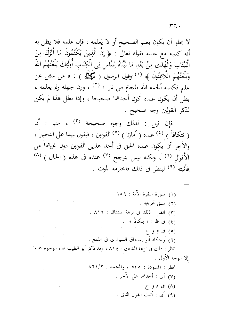 لا يخلو أن يكون يعلم الصحيح أو لا يعلمه، فإن علمه فلا يظن به أنه كتمه مع علمه بقوله تعالى: {إِنَّ الَّذِينَ يَكْتُمُونَ مَا أَنزَلْنَا مِنْ الْبَيِّنَاتِ وَالْهُدَى مِنْ بَعْدِ مَا بَيَّنَّاهُ لِلنَّاسِ فِي الْكِتَابِ أُوْلَئِكَ يَلْعَنُهُمْ اللَّهُ وَيَلْعَنُهُمْ اللَاّعِنُونَ} وقول الرسول (صلى الله عليه وسلم): "من سئل عن علم فكتمه ألجمه الله بلجام من نار"، وإن جهله ولم يعلمه، بطل أن يكون عنده كون أحدهما صحيحاً، وإذا بطل هذا لم يكن لذكر القولين وجه صحيح.