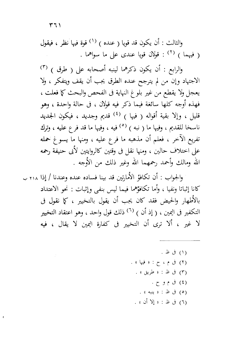 والرابع: أن يكون ذكرهما لينبه أصحابه على (طرق) الاجتهاد وإن من لم يترجح عنده الطرق يجب أن يقف ويتفكر، ولا يعجل ولا يقطع من يغر بلوغ النهاية في الفحص والبحث كما فعلت، فهذه أوجه كلها سائغة فيما ذكر فيه قولان، في حالة واحدة، وهو قليل، وإلا بقية أقواله (فيها) قديم وجديد، فيكون الجديد ناسخاً للقديم، وفيها ما (نبه) فيه، وفيها ما قد فرع عليه، وترك تفريع الآخر، فعلم أن مذهبه ما فرع عليه، ومنها ما يسوغ حمله على اختلاف حالين، ومنها نقل في وقتين كالروايتين لأبي حنيفة رحمه الله ومالك وأحمد رحمهما الله وغير ذلك من الأوجه.