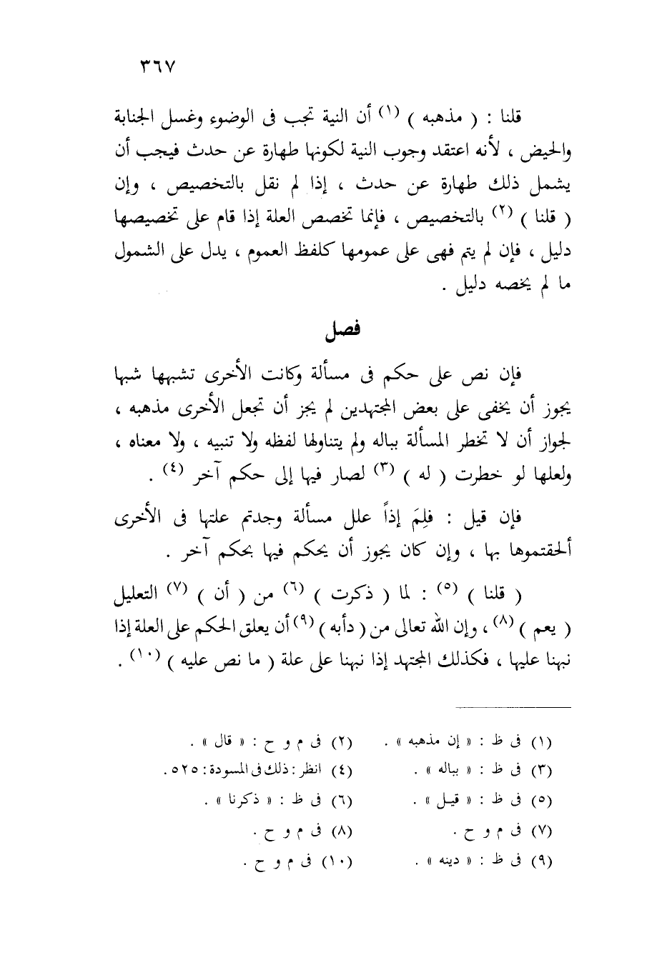 فإن نص على حكم في مسألة وكانت الأخرى تشبهها شبهاً يجوز أن يخفي على بعض المجتهدين لم يجز أن تجعل الأخرى مذهبه، لجواز أن لا تخطر المسألة بباله ولم يتناولها لفظه ولا تنبيه، ولا معناه، ولعلها لو خطرت (له) لصار فيها إلى حكم آخر.