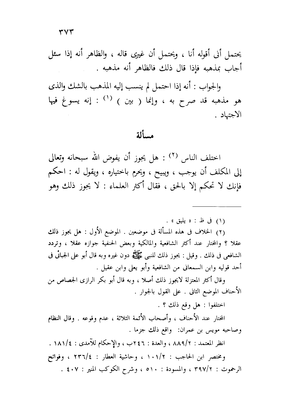 اختلف الناس: هل يجوز أن يفوض الله سبحانه وتعالى إلى المكلف أن يوجب، ويبيح، ويحرم باختياره، ويقول له: احكم فإنك لا تحكم إلا بالحق، فقال أكثر العلماء: لا يجوز ذلك وهو