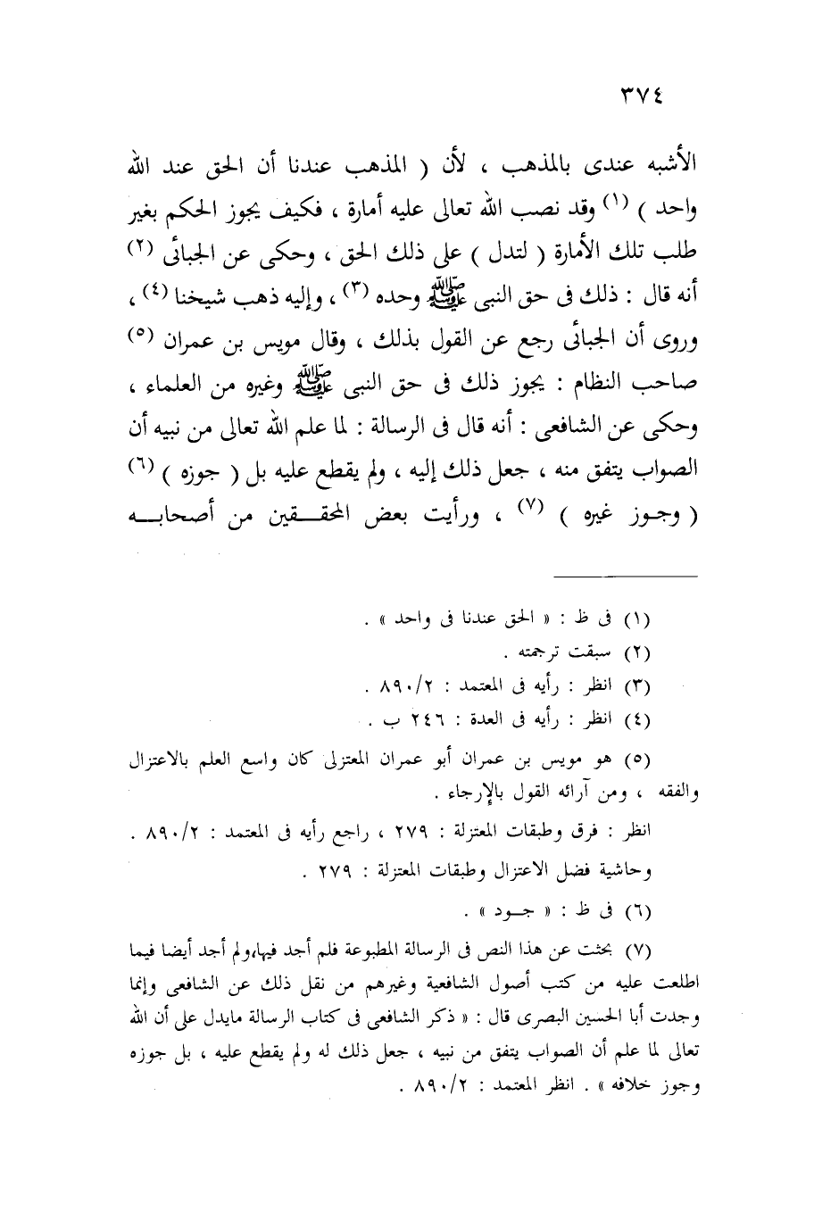 الأشبه عندي بالمذهب، لأن (المذهب عندنا أن الحق عند الله واحد) وقد نصب الله تعالى عليه أمارة، فكيف يجوز الحكم بغير طلب تلك الأمارة (لتدل) على ذلك الحق، وحكى عن الجبائي أنه قال: ذلك في حق النبي صلى الله عليه وسلم وحده، وإليه ذهب شيخنا، وروى أن الجبائي رجع عن القول بذلك، وقال مويس بن عمران صاحب النظام: يجوز ذلك في حق النبي صلى الله عليه وسلم وحده، وإليه ذهب شيخنا، وروى أن الجبائي رجع عن القول بذلك، وقال مويس بن عمران صاحب النظام: يجوز ذلك في حق النبي صلى الله عليه وسلم وغيره من العلماء، وحكى عن الشافعي: أنه قال في الرسالة: لما علم الله تعالى من نبيه أن الصواب يتفق منه، جعل ذلك إليه، ولم يقطع عليه بل (جوزه) (وجوز غيره)، ورأيت بعض المحققين من أصحابه