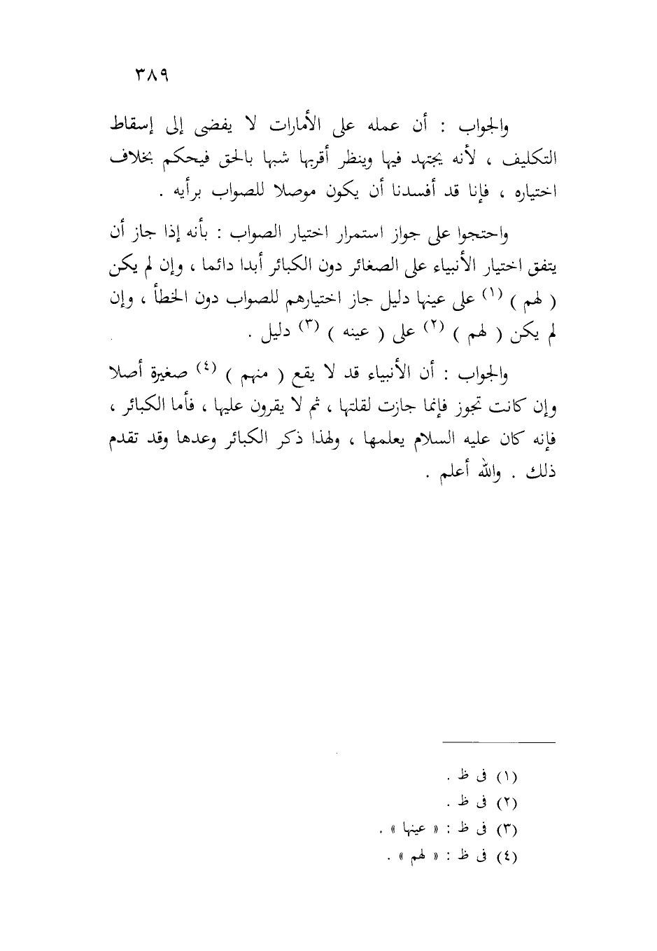 واحتجوا على جواز استمرار اختيار الصواب: بأنه إذا جاز أن يتفق اختيار الأنبياء على الصغائر دون الكبائر أبداً دائماً، وإن لم يكن (لهم) على عينها دليل جاز اختيارهم للصواب دون الخطأ، وإن لم يكن (لهم) على (عينه) دليل.