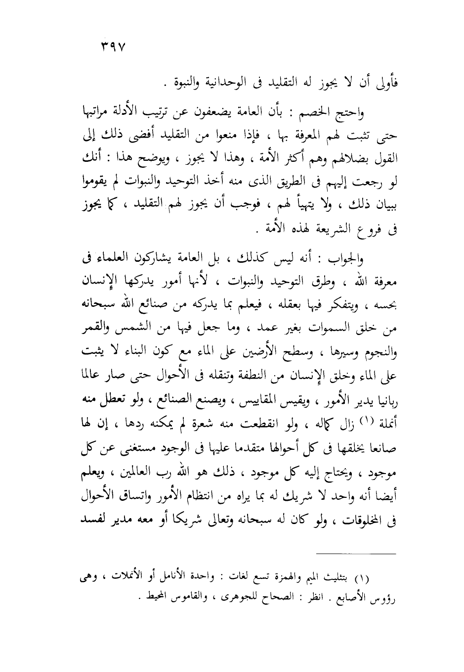واحتج الخصم: بأن العامة يضعفون عن ترتيب الأدلة مراتبها حتى تثبت لهم المعرفة بها، فإذا منعوا من التقليد أفضى ذلك إلى القول بضلالهم وهم أكثر الأمة، وهذا لا يجوز، ويوضح هذا: أنك لو رجعت إليهم في الطريق الذي منه أخذ التوحيد والنبوات لم يقوموا ببيان ذلك، ولا يتهيأ لهم، فوجب أن يجوز لهم التقليد، كما يجوز في فروع الشريعة لهذه الأمة.